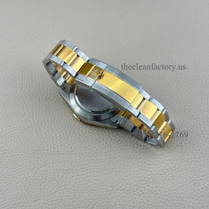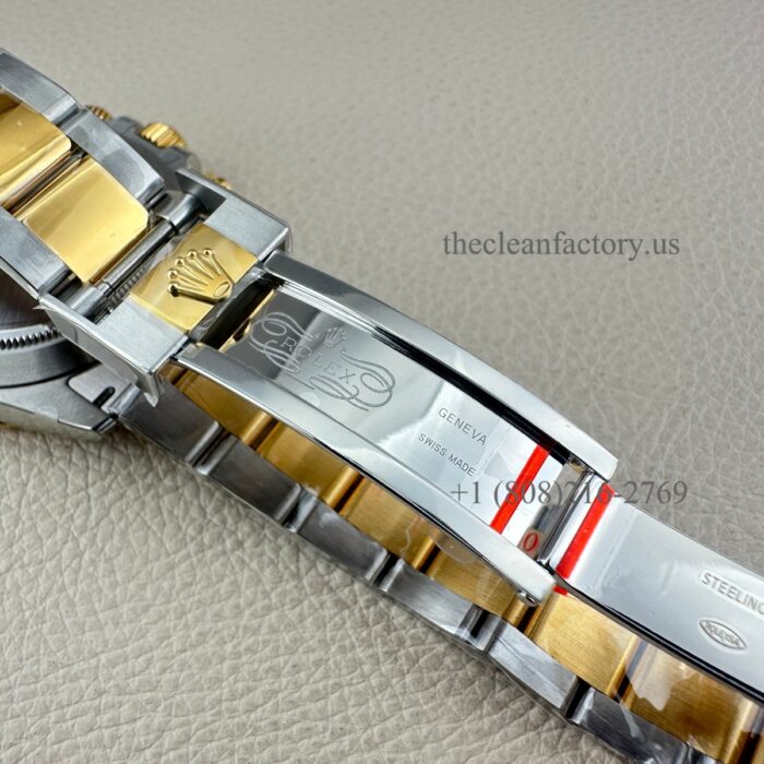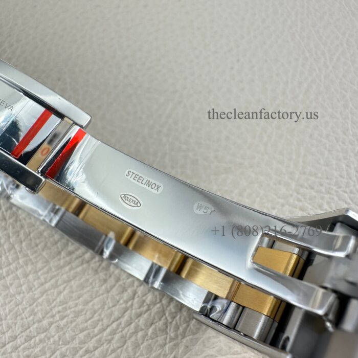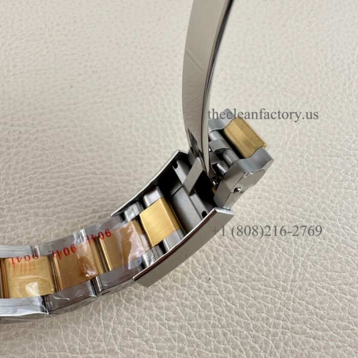 BRACELET | – Oyster design, flat three-piece links – Real 18kt gold about 4um thickness wrapped.(two sides of the middle in gold too) Ensure that it will not fade and is healthy Skin-friendly. Insider Solid 904L Stainless steel – Solid threaded screws – Folding Oysterlock safety clasp with Easylink 5 mm comfort extension link for quick set |