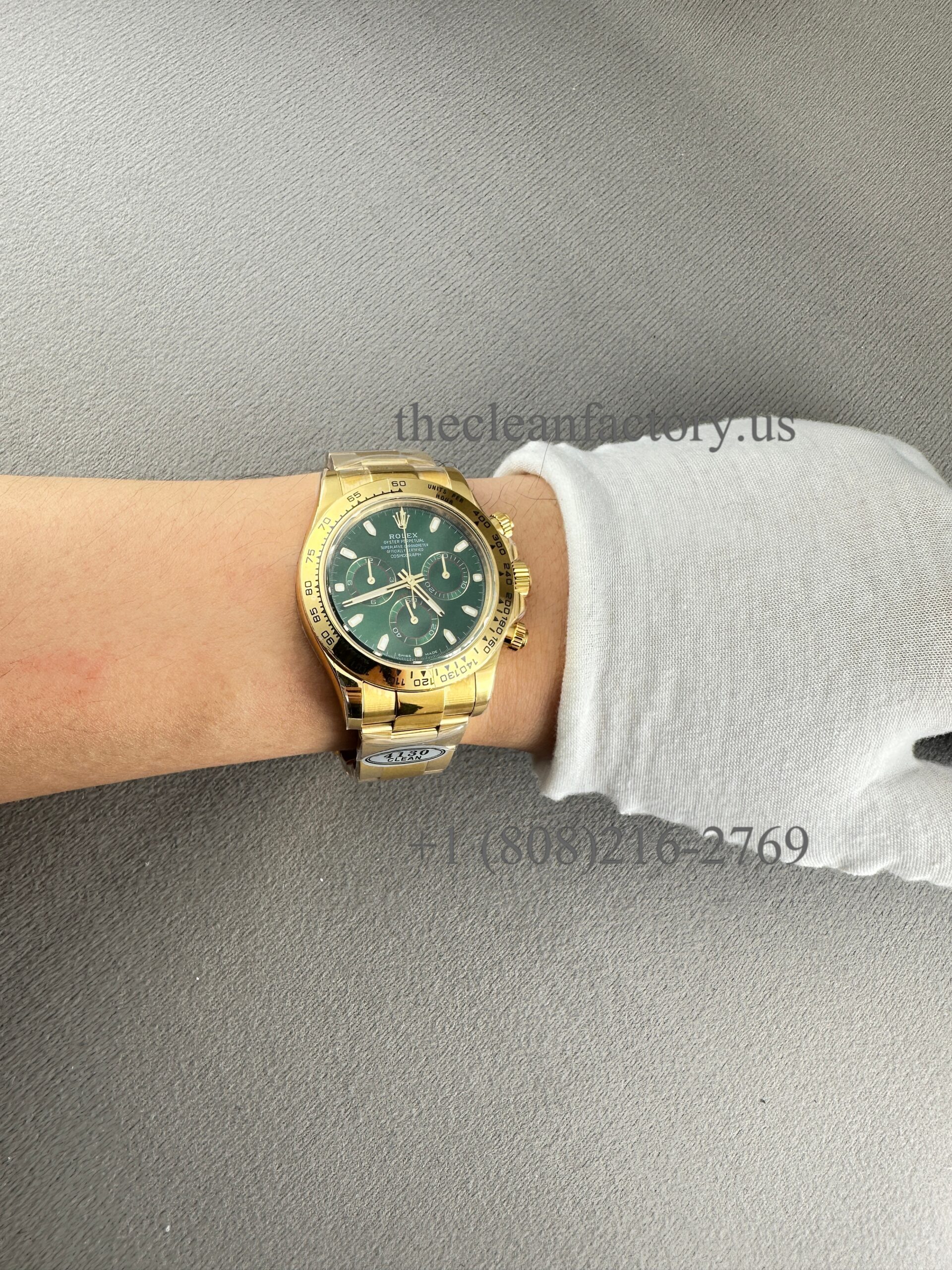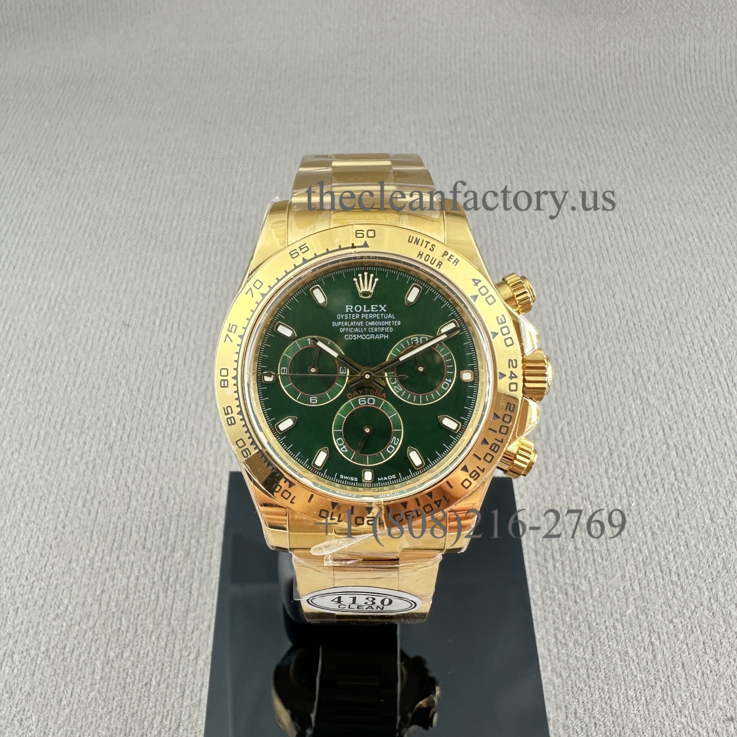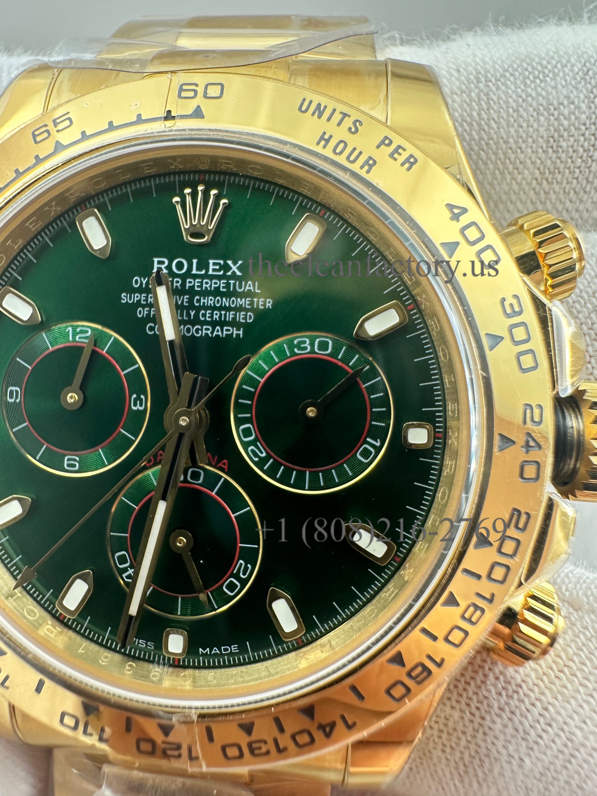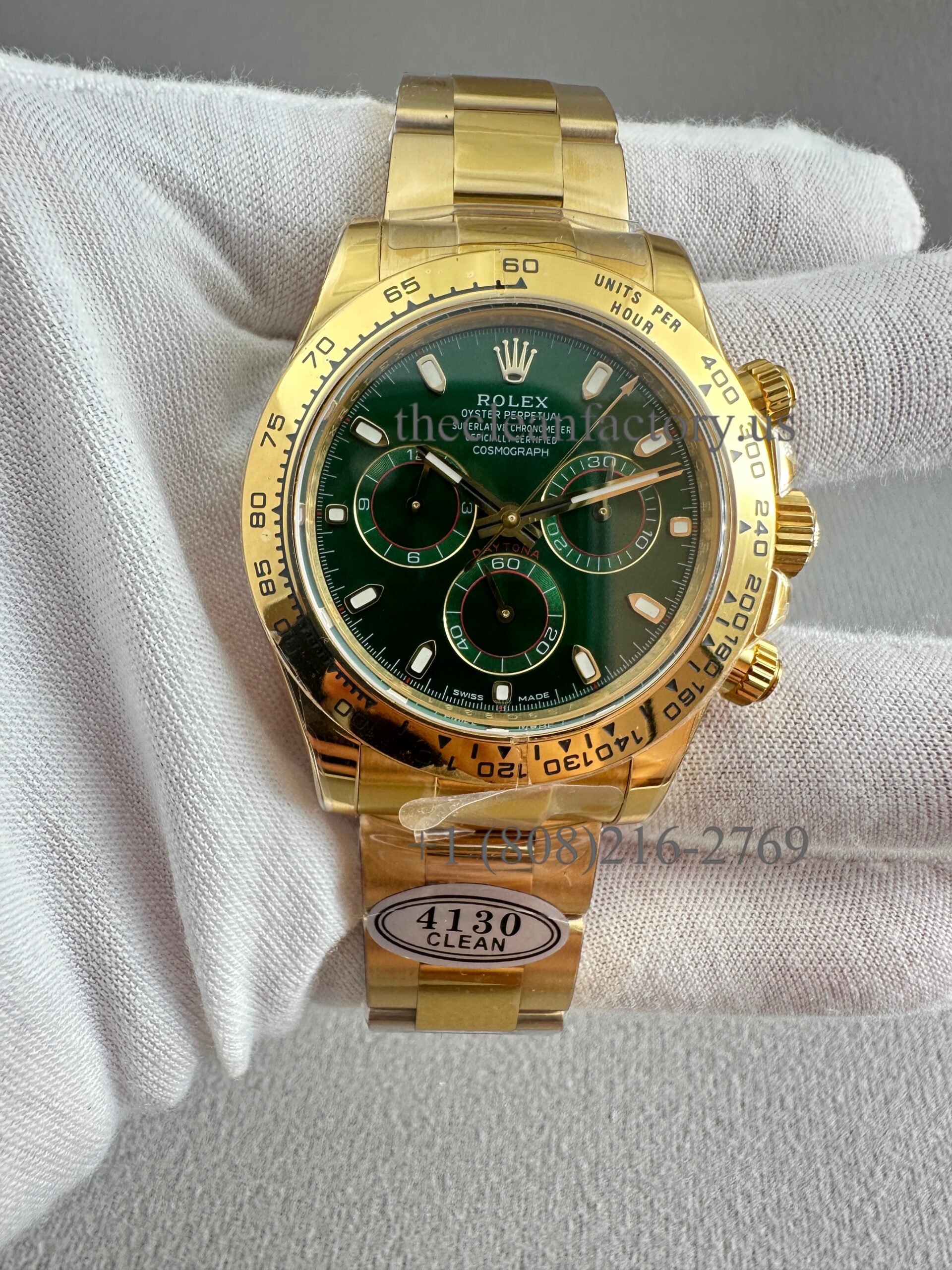 18kt yellow gold case with an 18kt yellow gold bracelet. Fixed 18kt yellow gold bezel showing tachymeter markings. Green dial with luminous yellow gold hands and index hour markers. Minute markers around the outer rim. Dial Type: Analog. Luminescent hands and markers. Chronograph – three Green sub-dials displaying: 60 second, 30 minutes, and 1/10th of a second. Automatic movement with a 64-hour power reserve. Scratch-resistant sapphire crystal. Screw down crown. Solid case back. Case diameter: 40 mm. Case thickness: 12.5 mm. Round case shape. Band width: 14.5 mm / 20 mm. Band length: 7.5 inches. Oyster clasp. Water-resistant at 100 meters / 330 feet. Functions: chronograph, hour, minute, second.