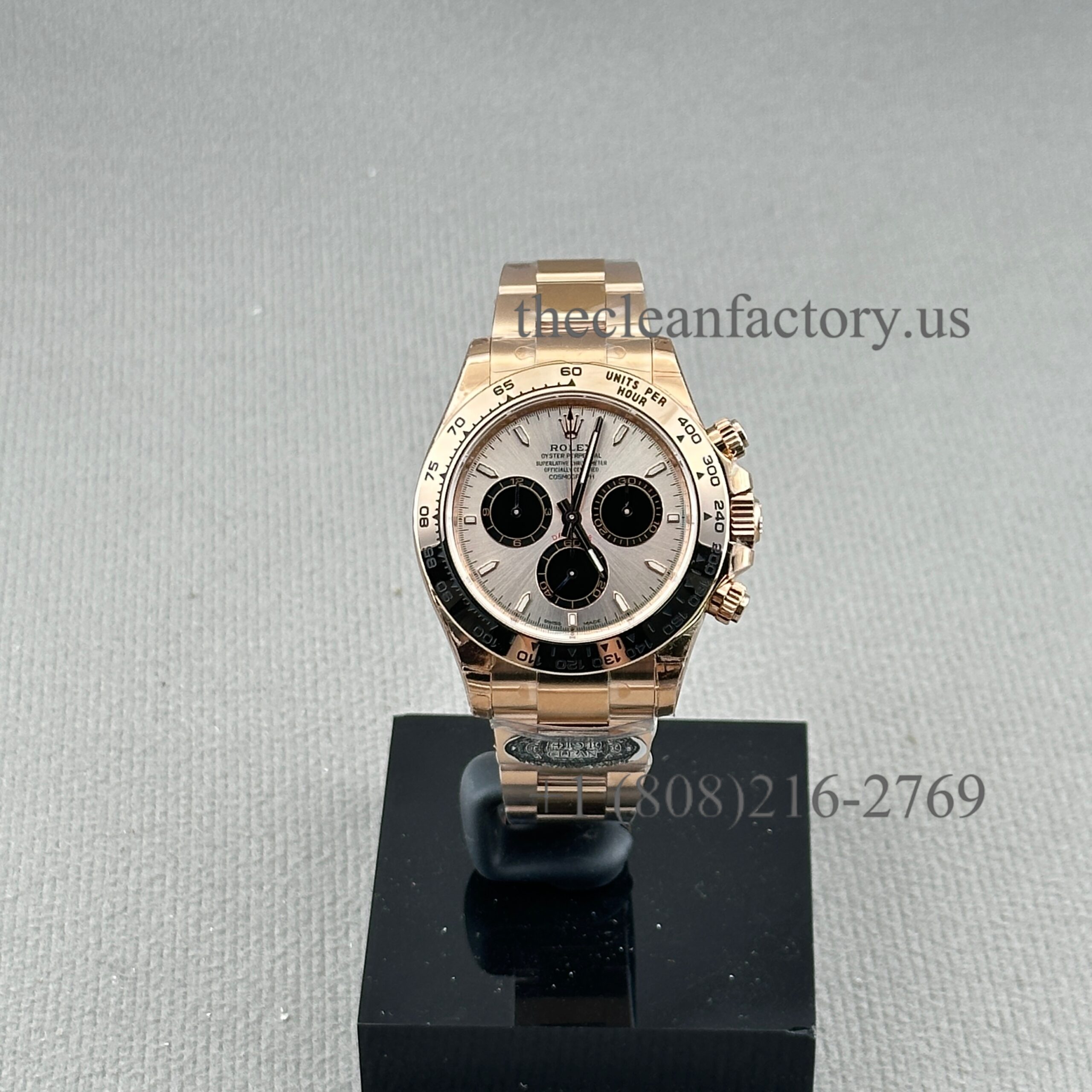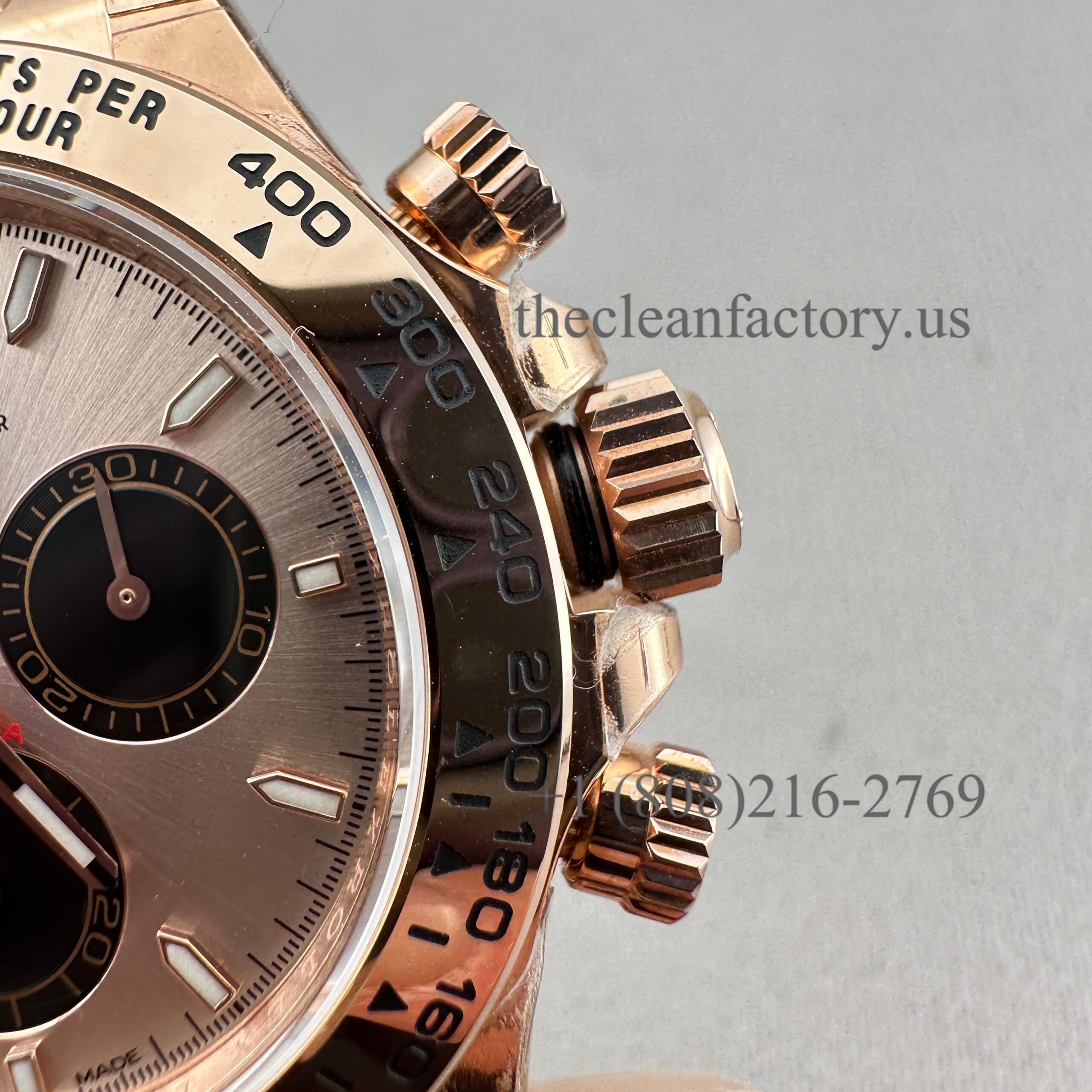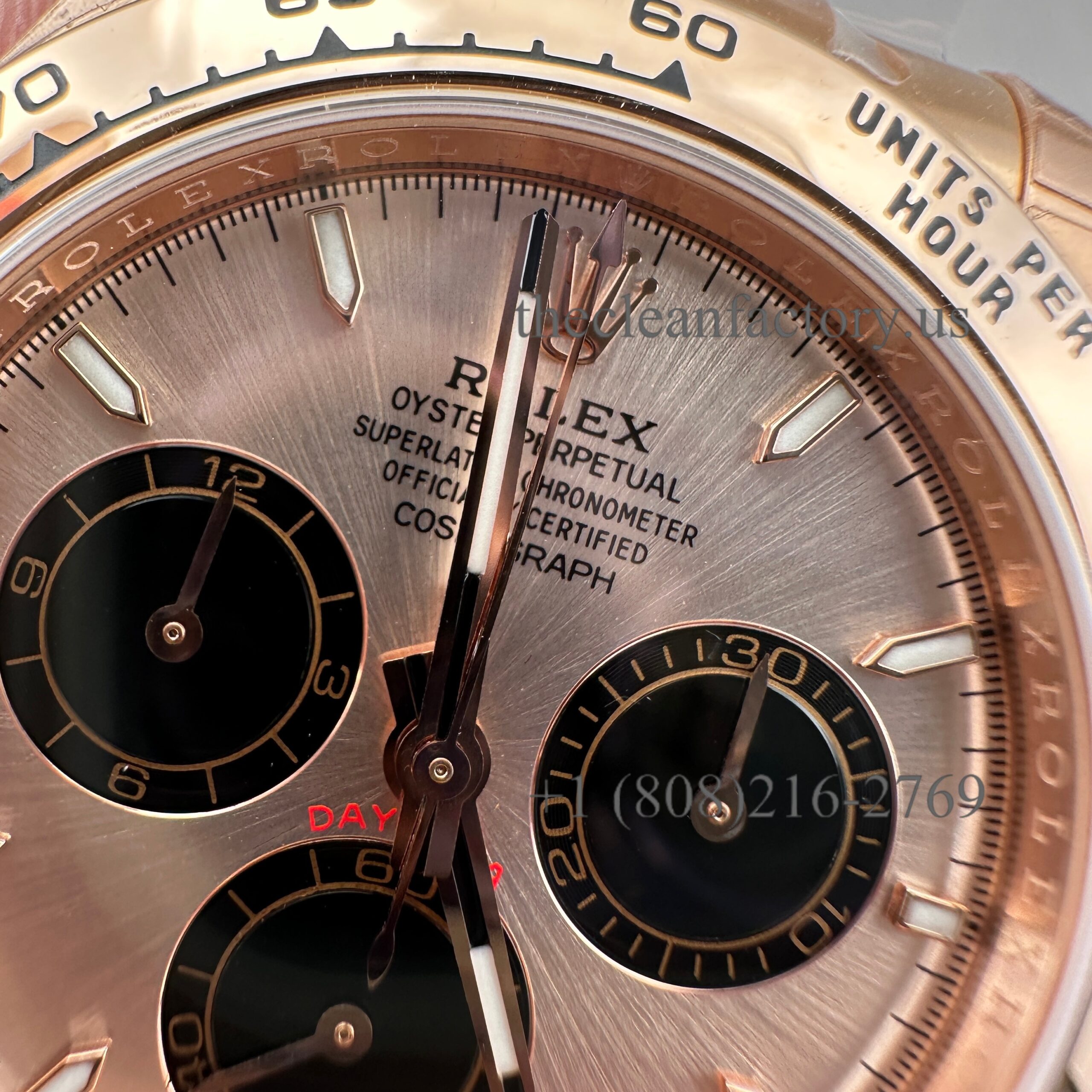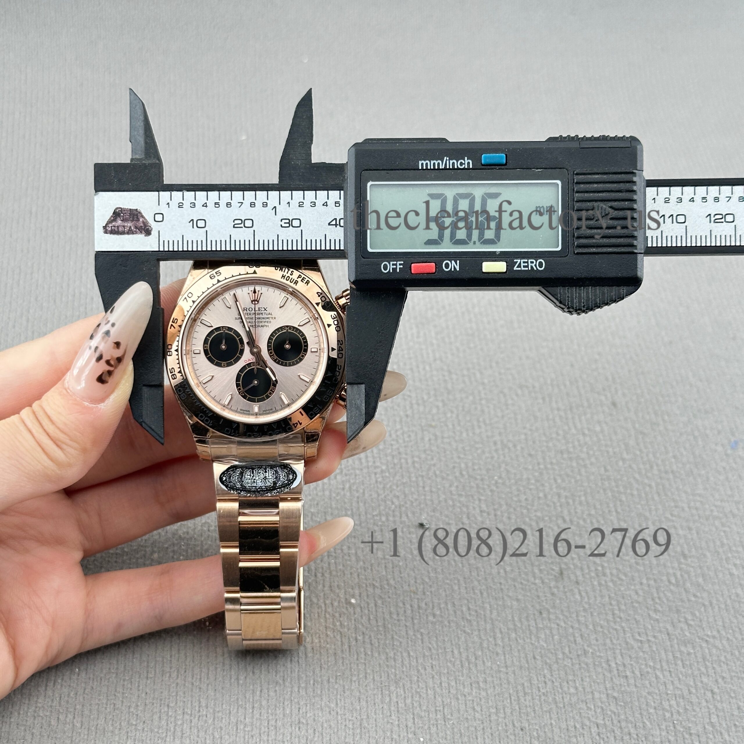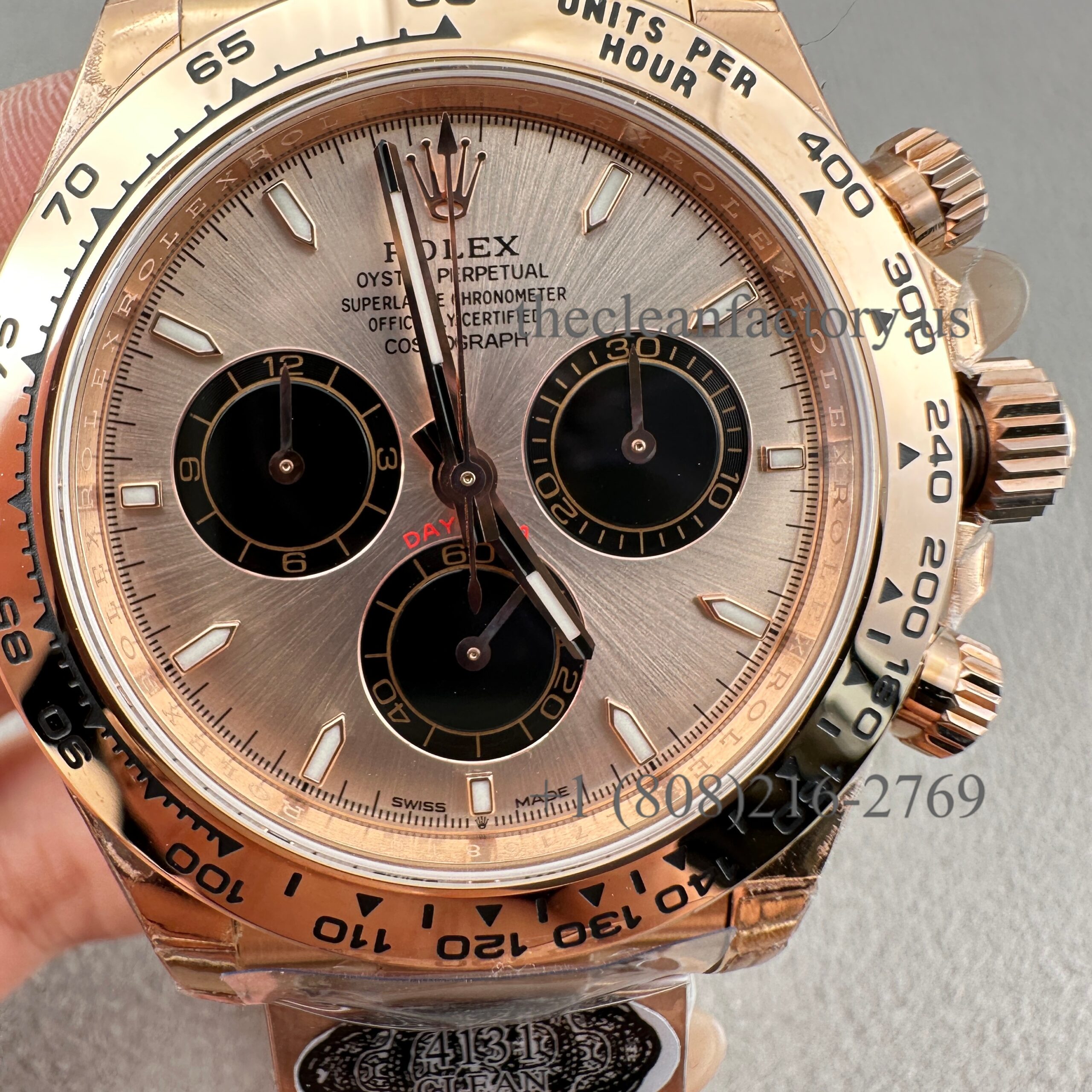 40mm 18k Everose gold, screw-down case back and winding crown with Triplock triple waterproofness system, Fixed bezel, scratch-resistant sapphire crystal, Sundust and bright black dial, Rolex caliber 4131 Perpetual, mechanical chronograph, self-winding movements with Centre hour and minute hands, small seconds hand at 6 o’clock. Chronograph via centre seconds hand, 30-minute counter at 3 o’clock and 12-hour counter at 9 o’clock. Stop seconds for exact time setting. Waterproof to 100 meters.