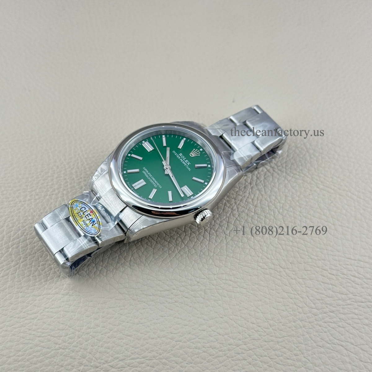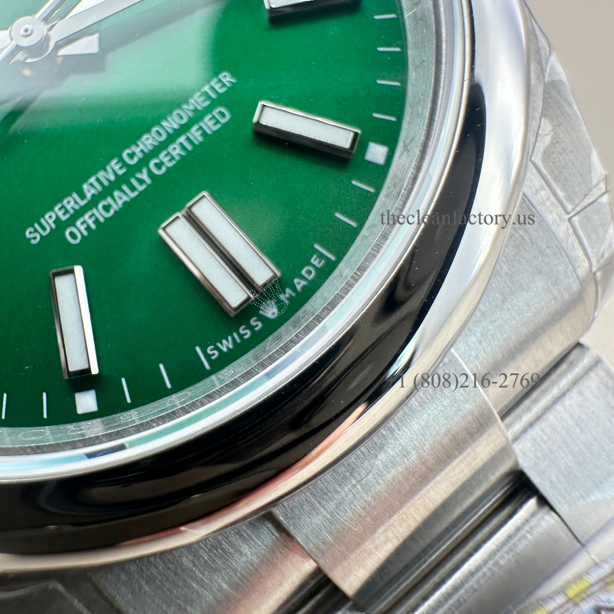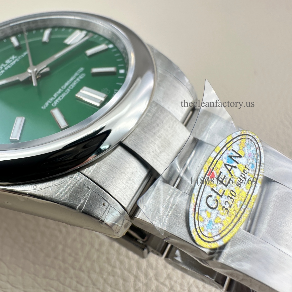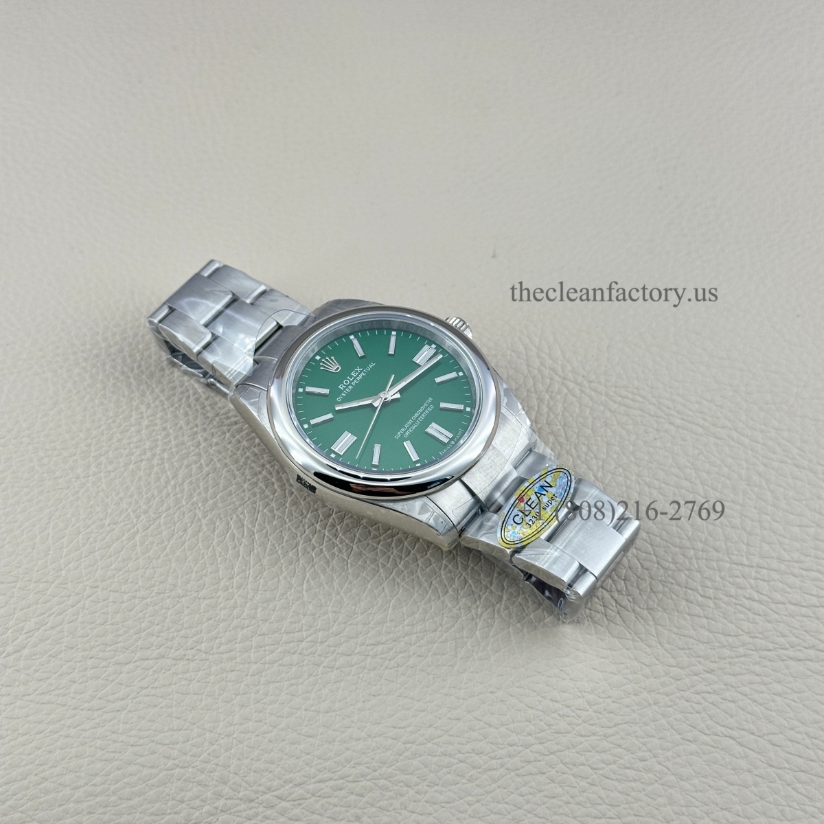 Rolex Oyster Perpetual 124300-0003, 41 mm. The watch has Green Dial. The Case is Oystersteel w/ 3230 Movement, 56 hours power reserve. The Bracelet Oystersteel with Folding Oysterclasp with Easylink 5 mm comfort extension link. The Water-resistant is up to 100m.