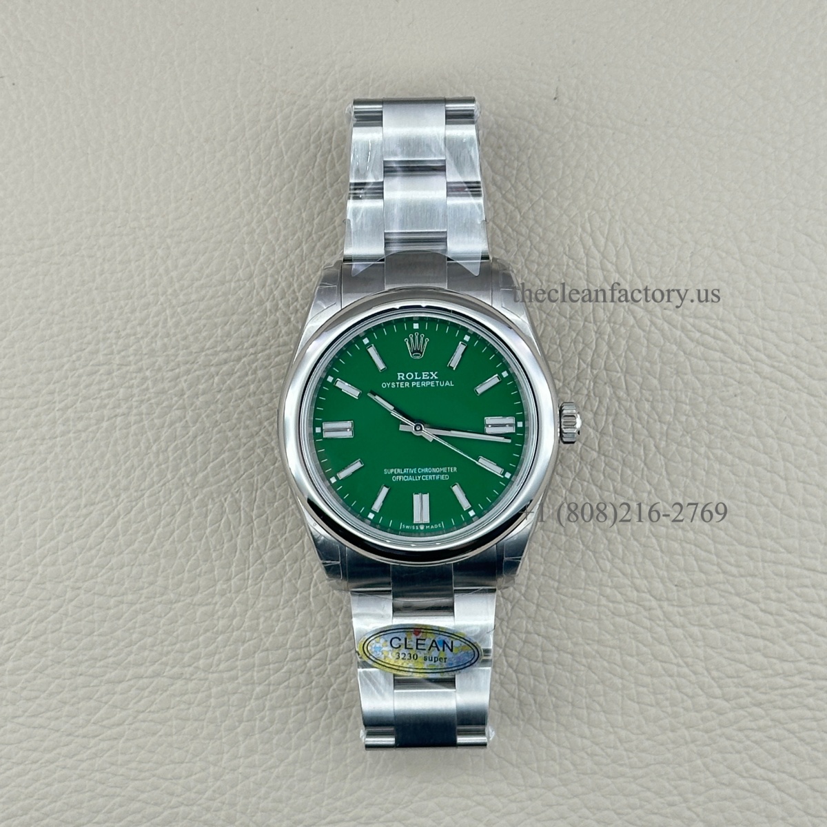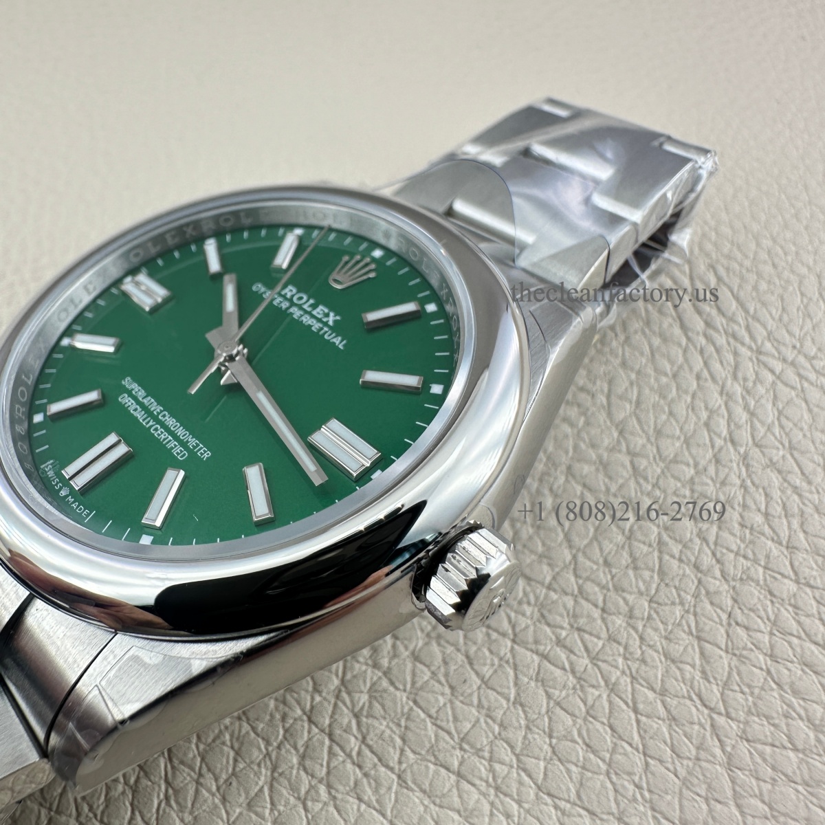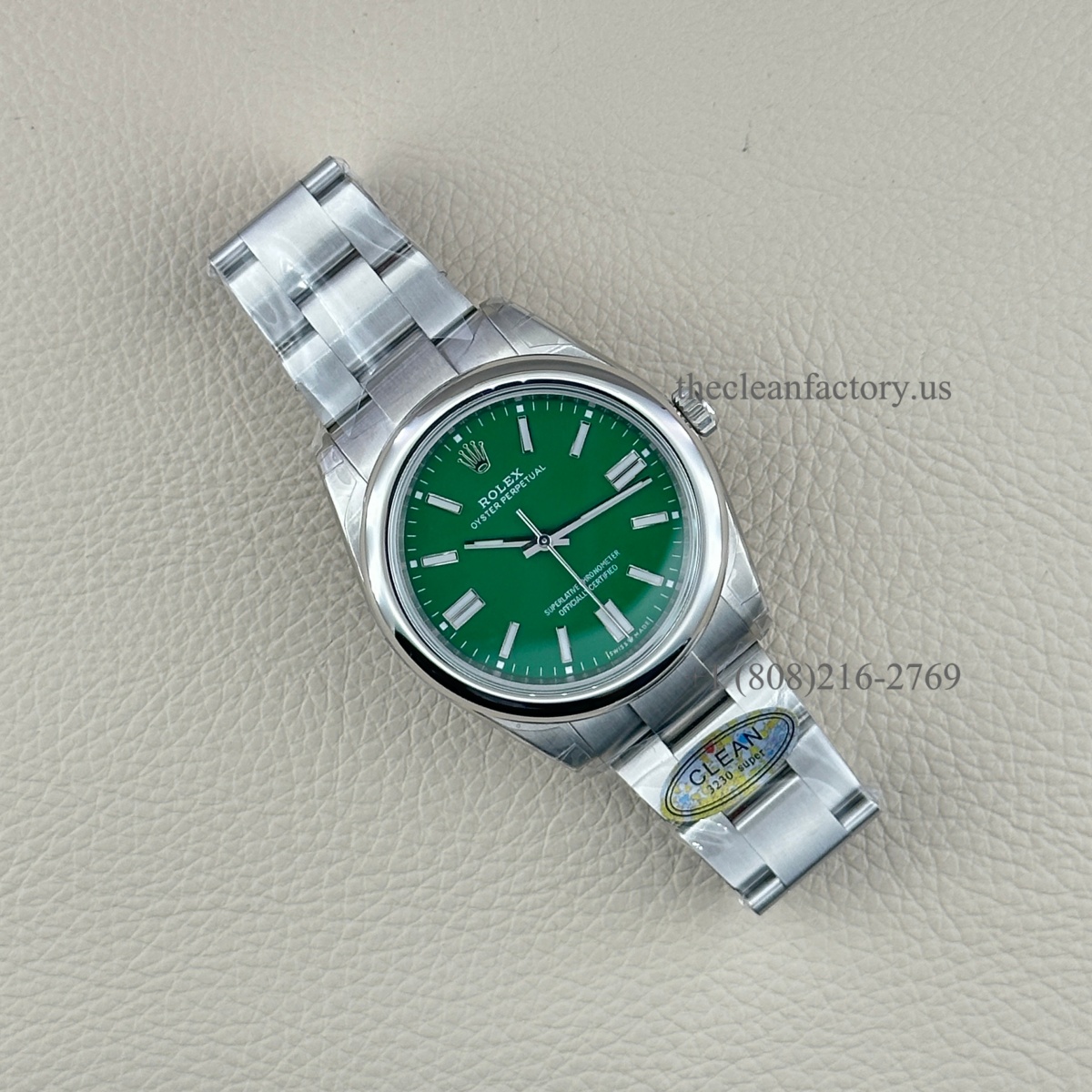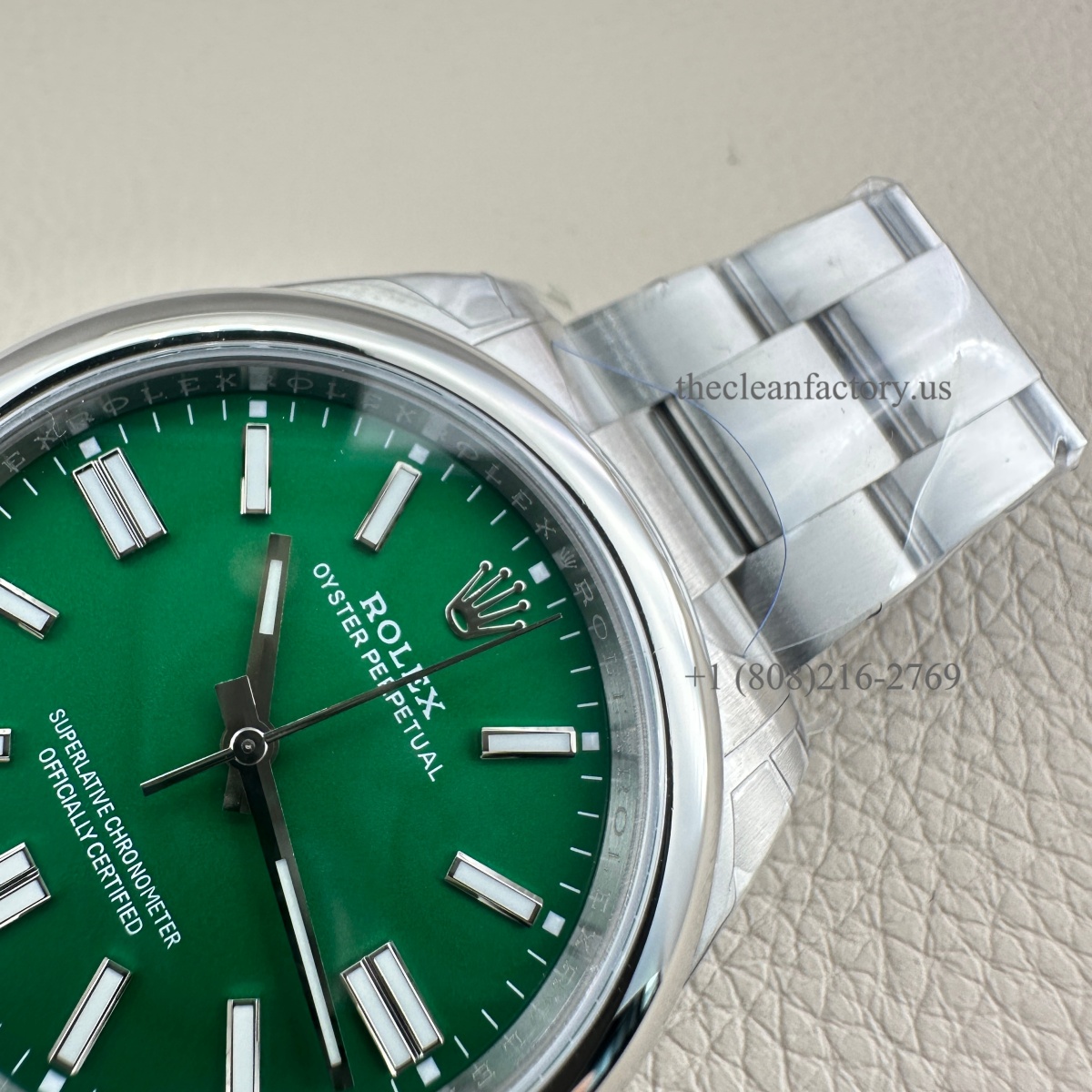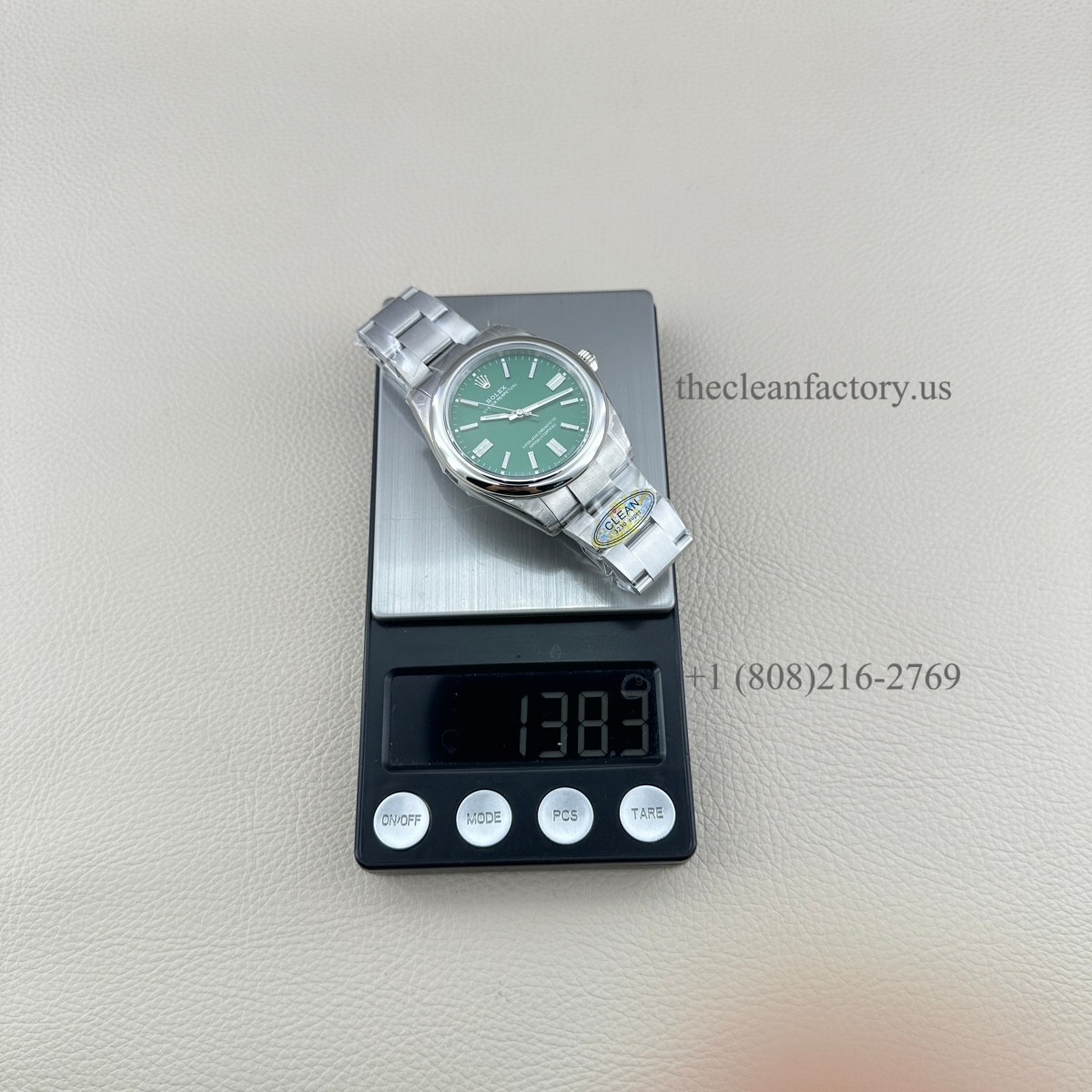 Rolex Oyster Perpetual 124300-0003, 41 mm. The watch has Green Dial. The Case is Oystersteel w/ 3230 Movement, 56 hours power reserve. The Bracelet Oystersteel with Folding Oysterclasp with Easylink 5 mm comfort extension link. The Water-resistant is up to 100m.