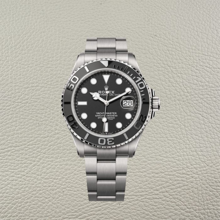 Men’s Rolex Yacht-Master 42mm RLX titanium, Intense black Dial on Oyster Bracelet, Reference # 226627 with Bidirectional rotatable 60-minute graduated bezel with matt black Cerachrom insert in ceramic, polished raised numerals and graduations bezel.