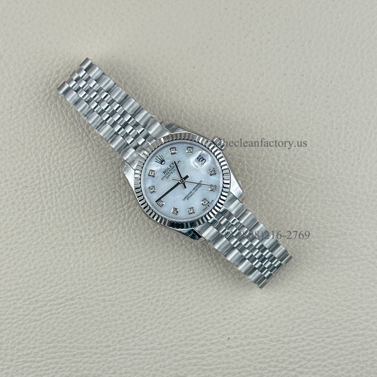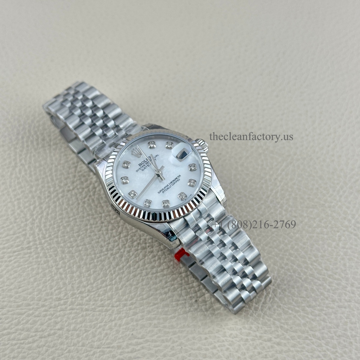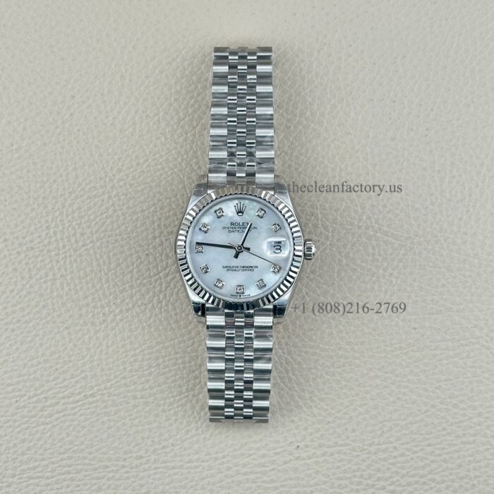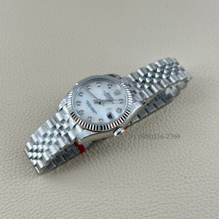 Rolex Datejust 278274-0006, 31 mm. The watch has White mother-of-pearl set with a diamonds Dial. The Case is White Rolesor – a combination of Oystersteel and 18 ct white gold w/ 2236 Movement, 48hours power reserve. The Bracelet Oystersteel with Concealed folding Crownclasp. The Water-resistant is up to 100m.