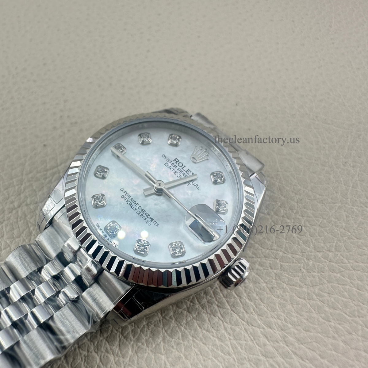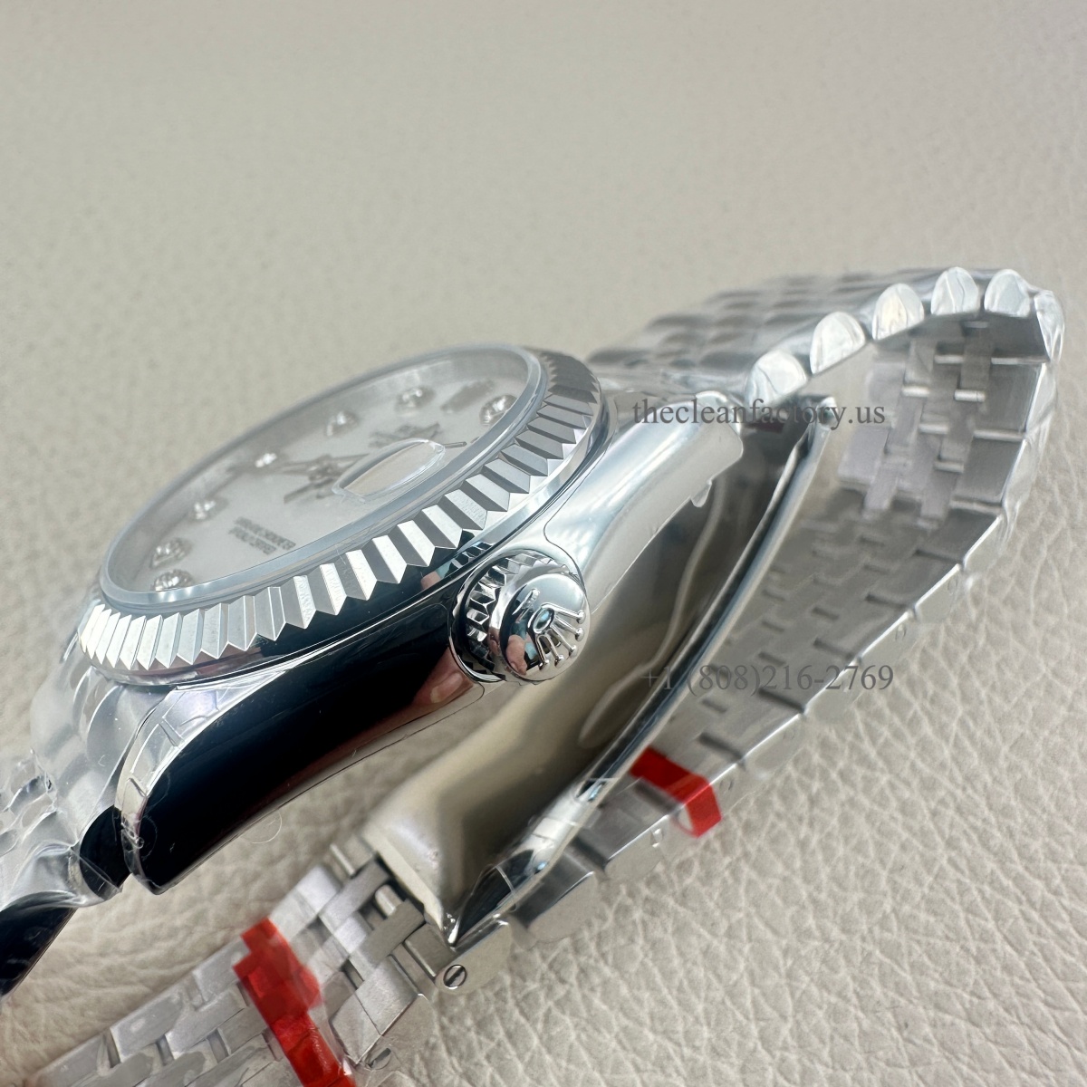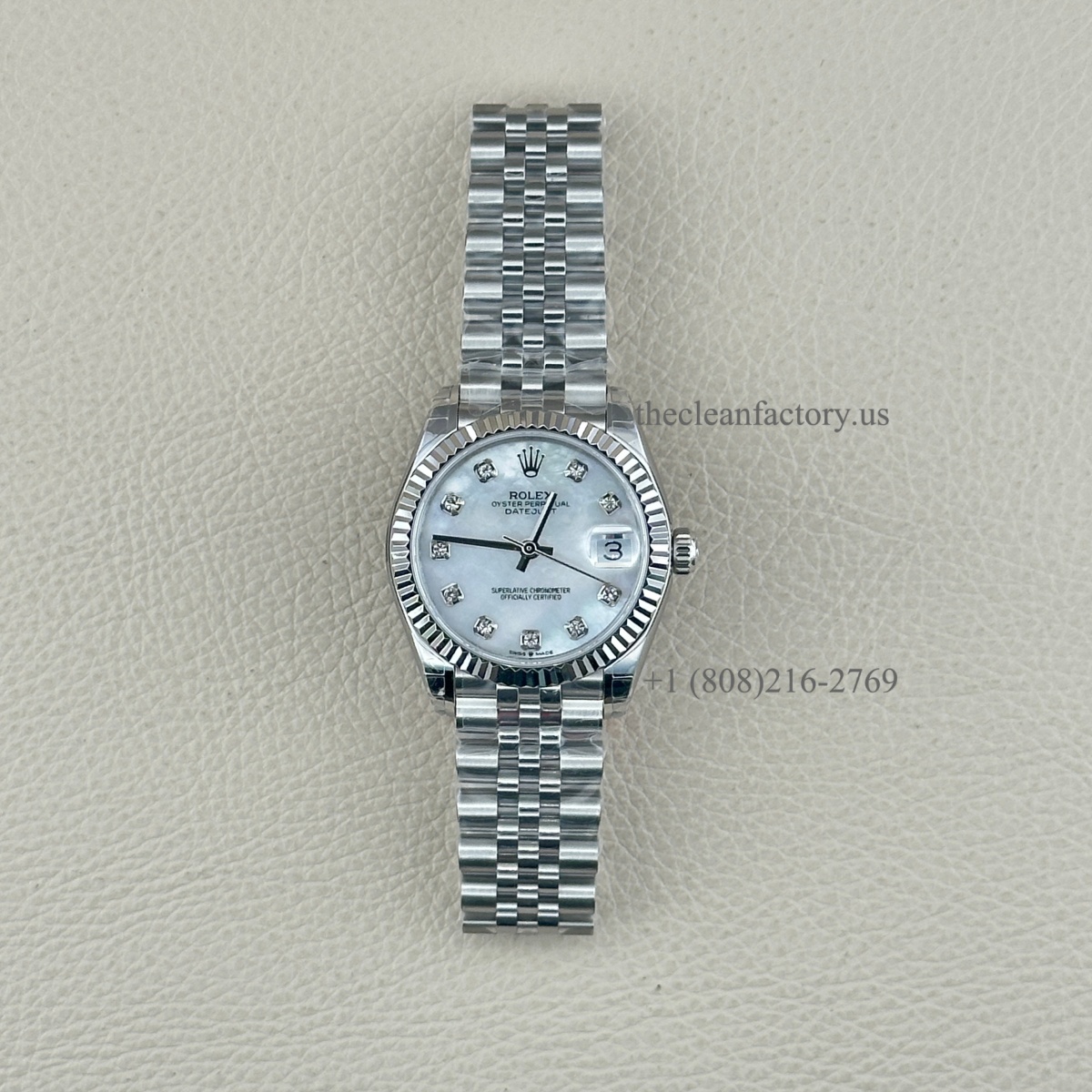 Rolex Datejust 278274-0006, 31 mm. The watch has White mother-of-pearl set with a diamonds Dial. The Case is White Rolesor – a combination of Oystersteel and 18 ct white gold w/ 2236 Movement, 48hours power reserve. The Bracelet Oystersteel with Concealed folding Crownclasp. The Water-resistant is up to 100m.