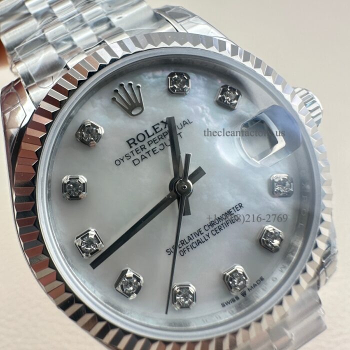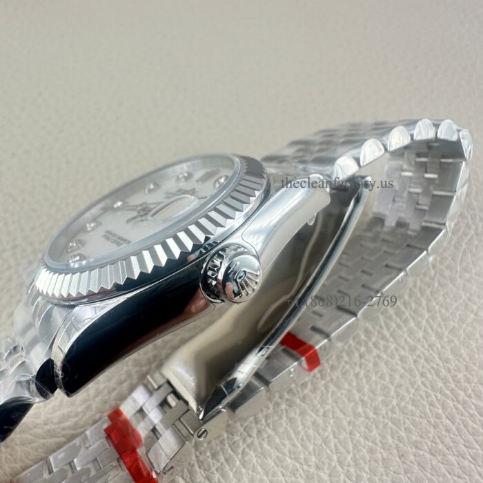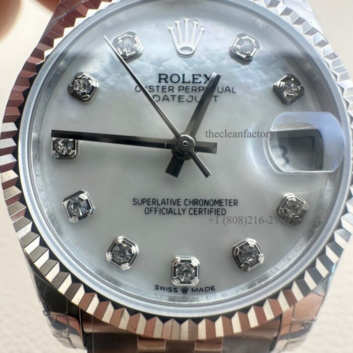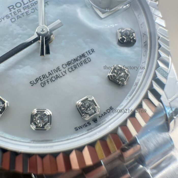 DIAL | – White mother-of-pearl lacquer. Hour markers with bright lume Superluminova blue luminescence phosphorescent that glows up to nine hours at night with uniform luminosity throughout – Highly legible with laser precision text, prints and engravings , 100% same as genuine – Correct Date font and size. – The color performance is no different from the genuine in Any light Angle – 18k gold wrapped hour markers and hands to prevent tarnishing |
