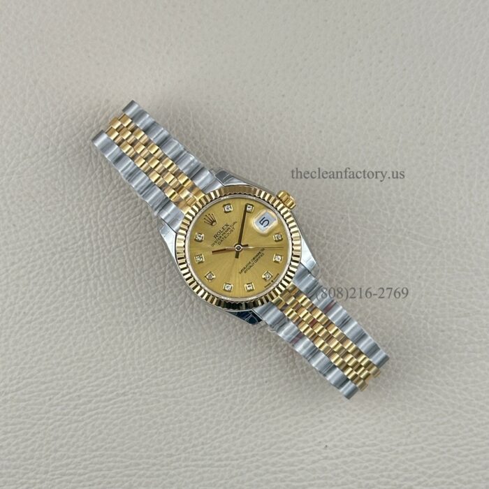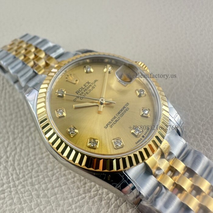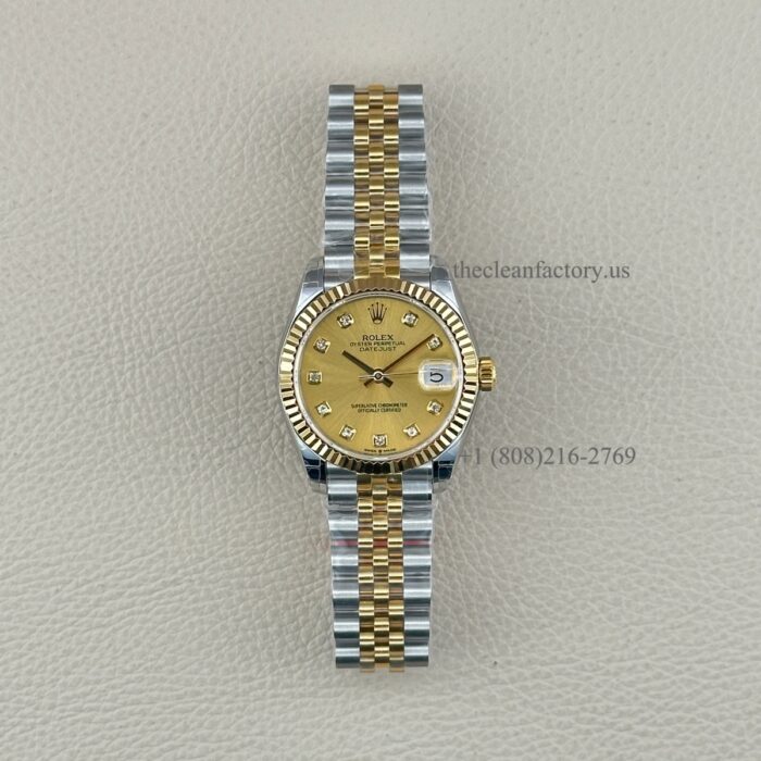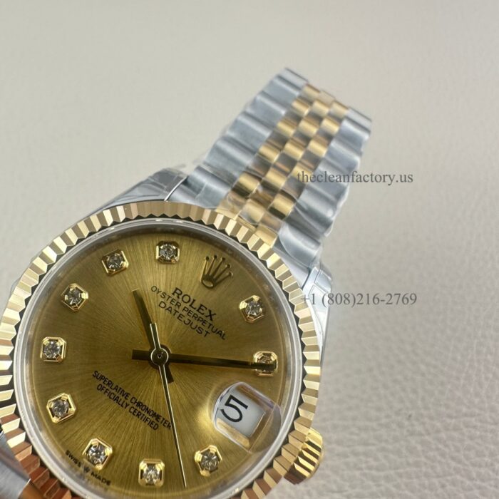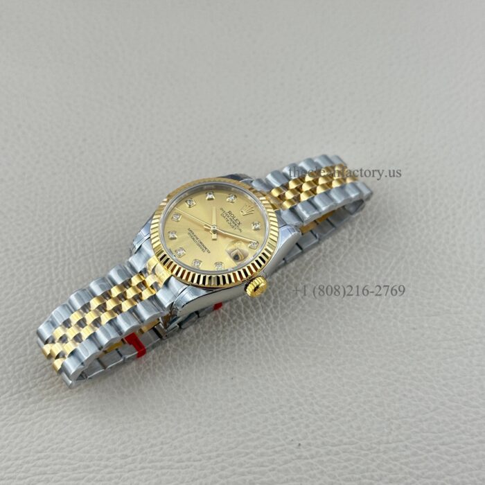Rolex Perpetual Datejust 31Watch, Two-Tone: Stainless Steel & 18k Yellow Gold. Champagne-colour Dial set with diamonds. Hour markers – Diamonds in 18 ct gold settings. The fluted bezel and Jubilee Bracelet, 278273-0026.