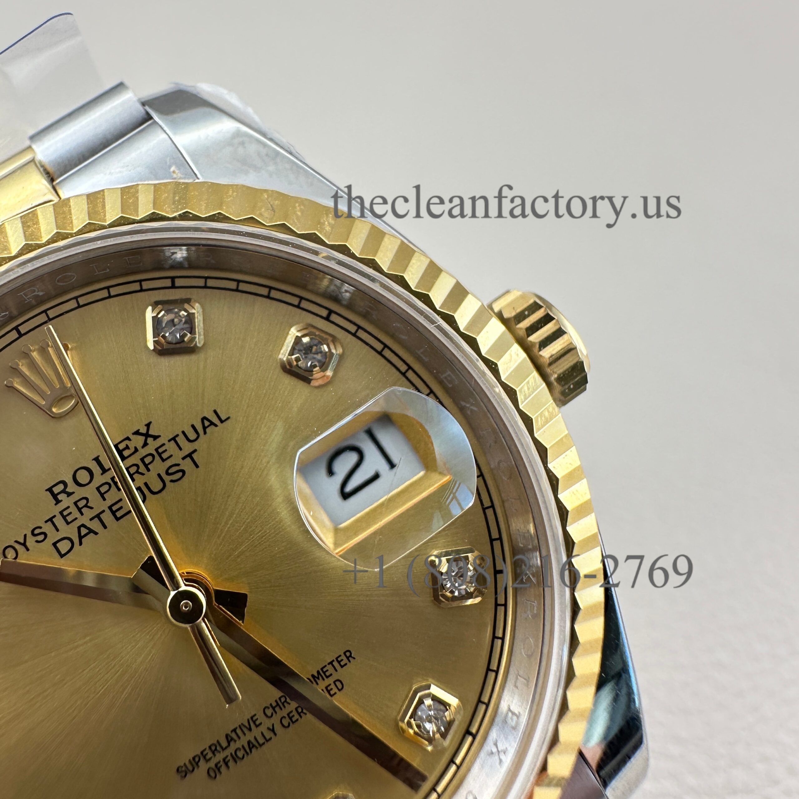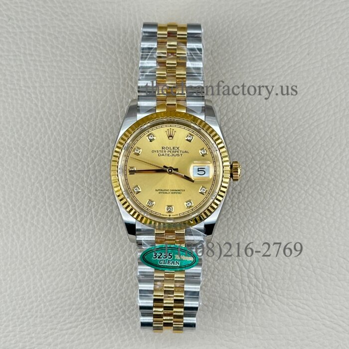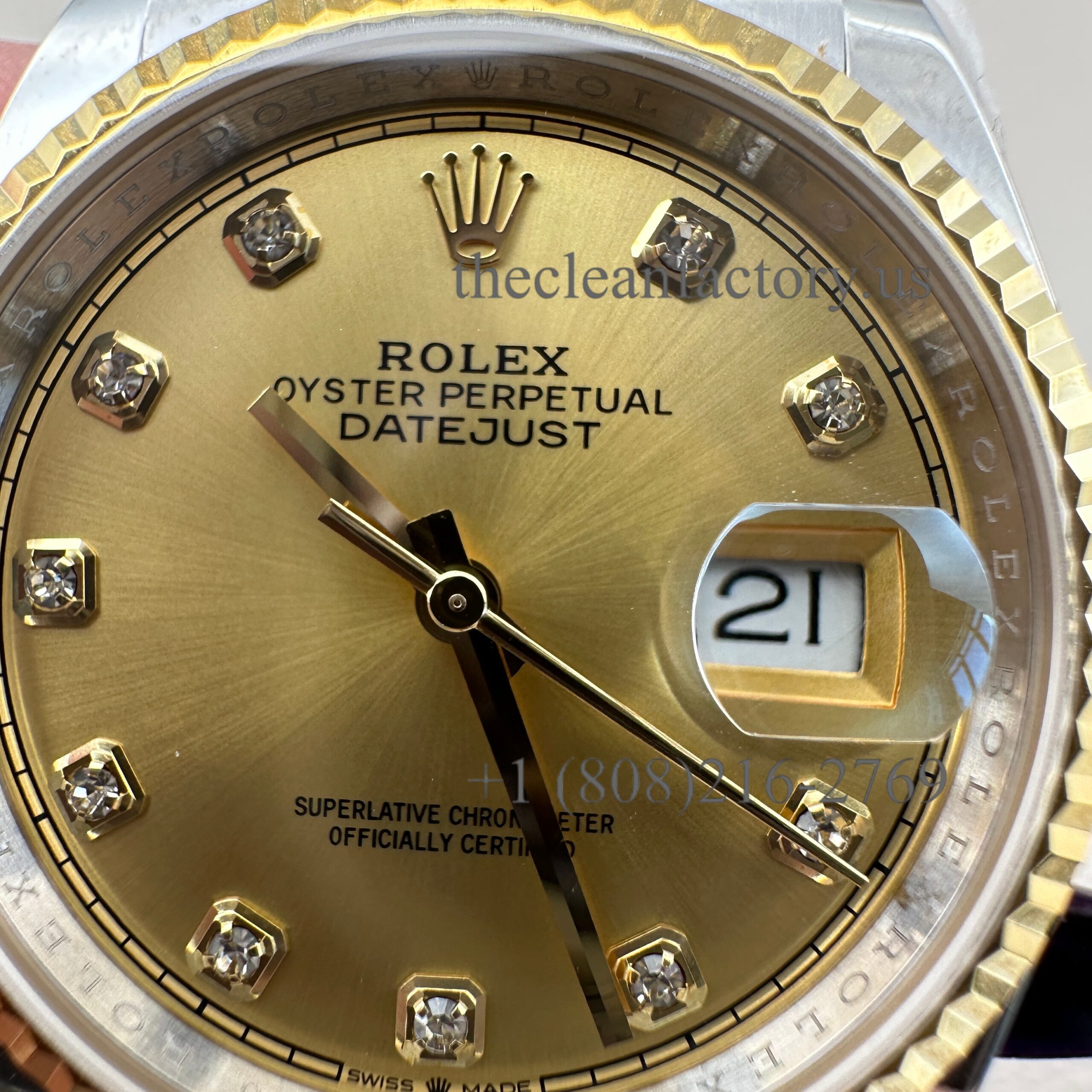 劳力士日志型 36 双色款:不锈钢和 18k 黄金。香槟色表盘镶嵌钻石、防刮蓝宝石水晶镜面,日期显示上方饰有凸透镜。时标 – 18k 金镶嵌钻石。腕表搭载 3235 型自动上链机械机芯,31 颗宝石,动力储存 60 小时。表带为 Jubilee 黄金钢和不锈钢表带。搭配折叠蚝式带扣和 Easylink 5 毫米舒适延长链节。防水深度 100 米/330 英尺。