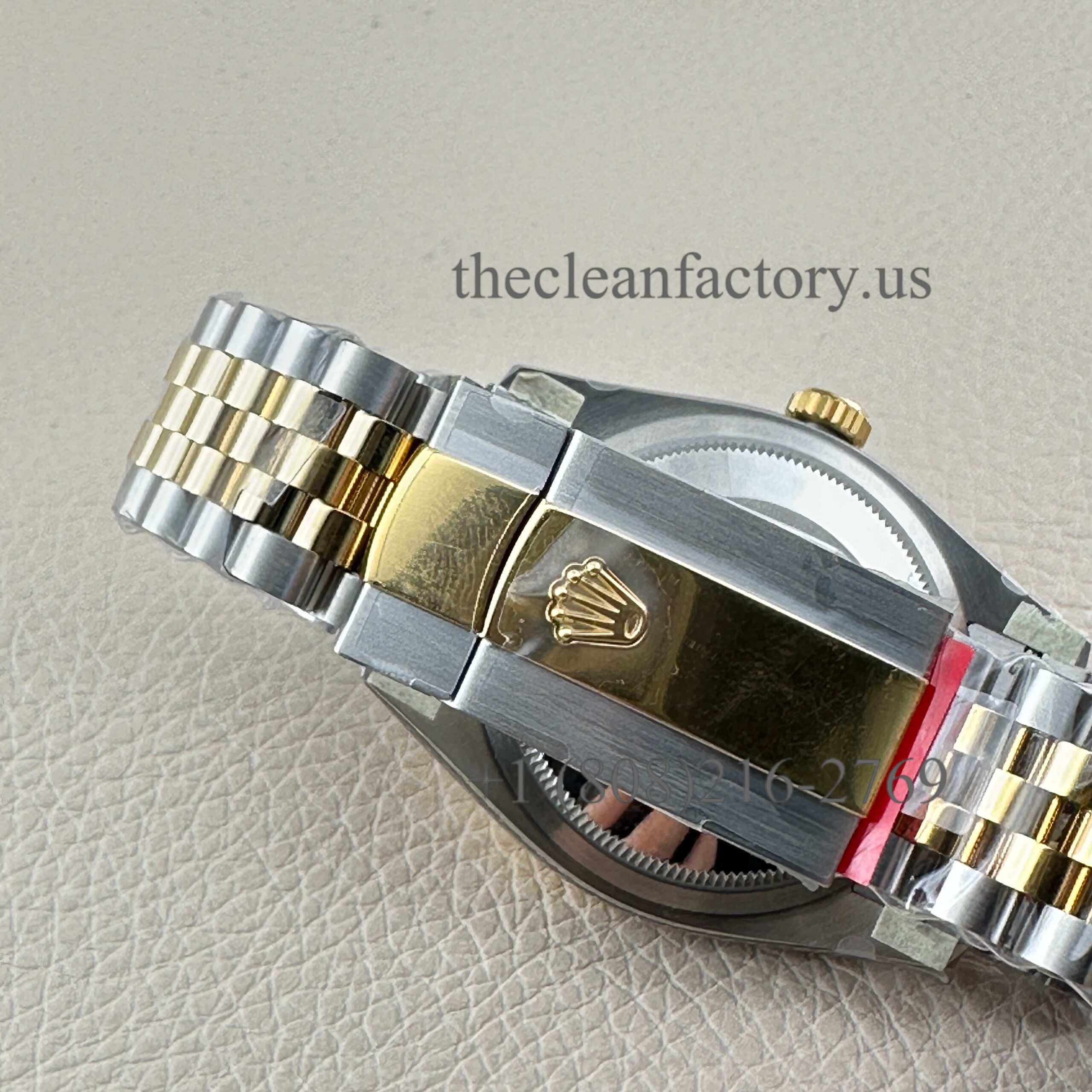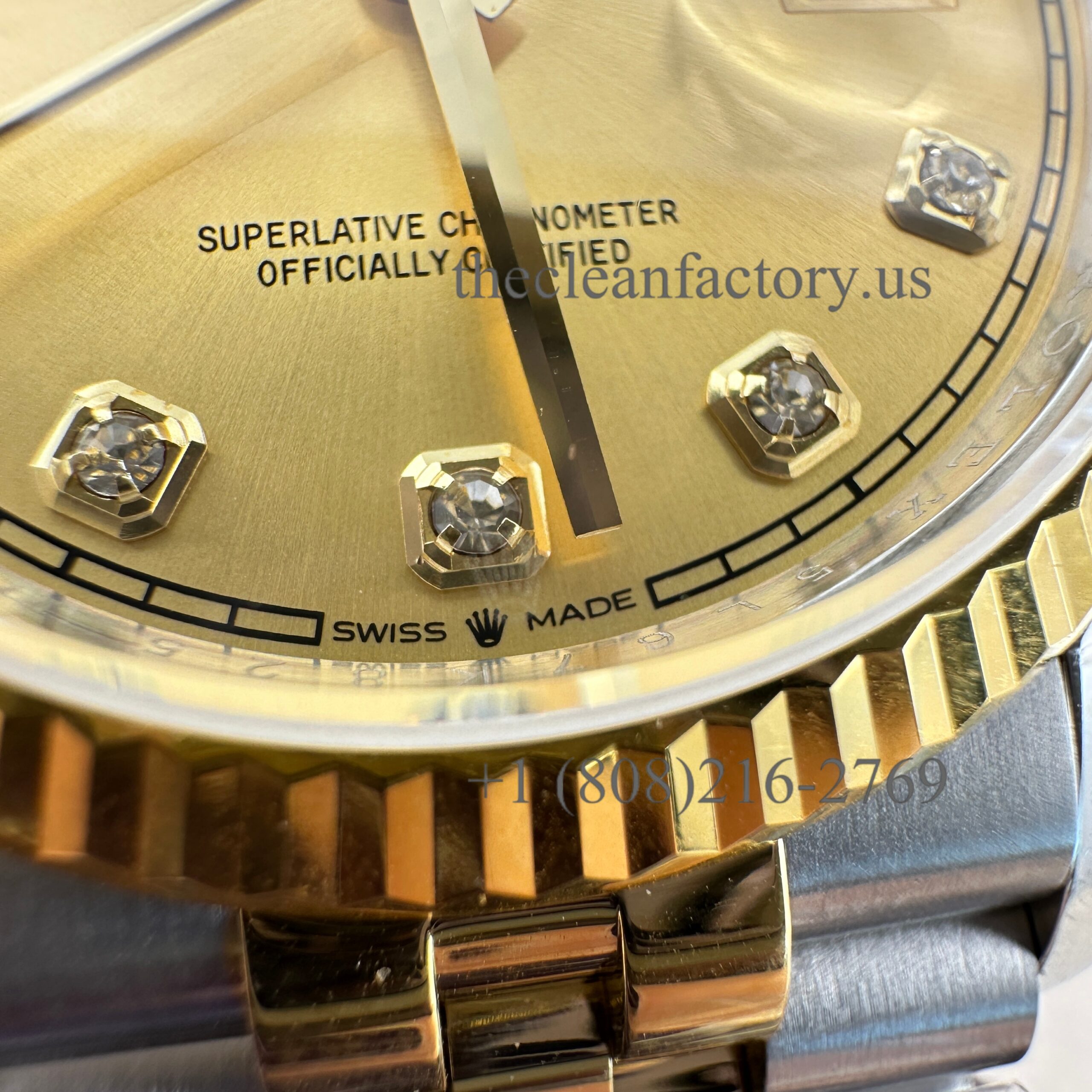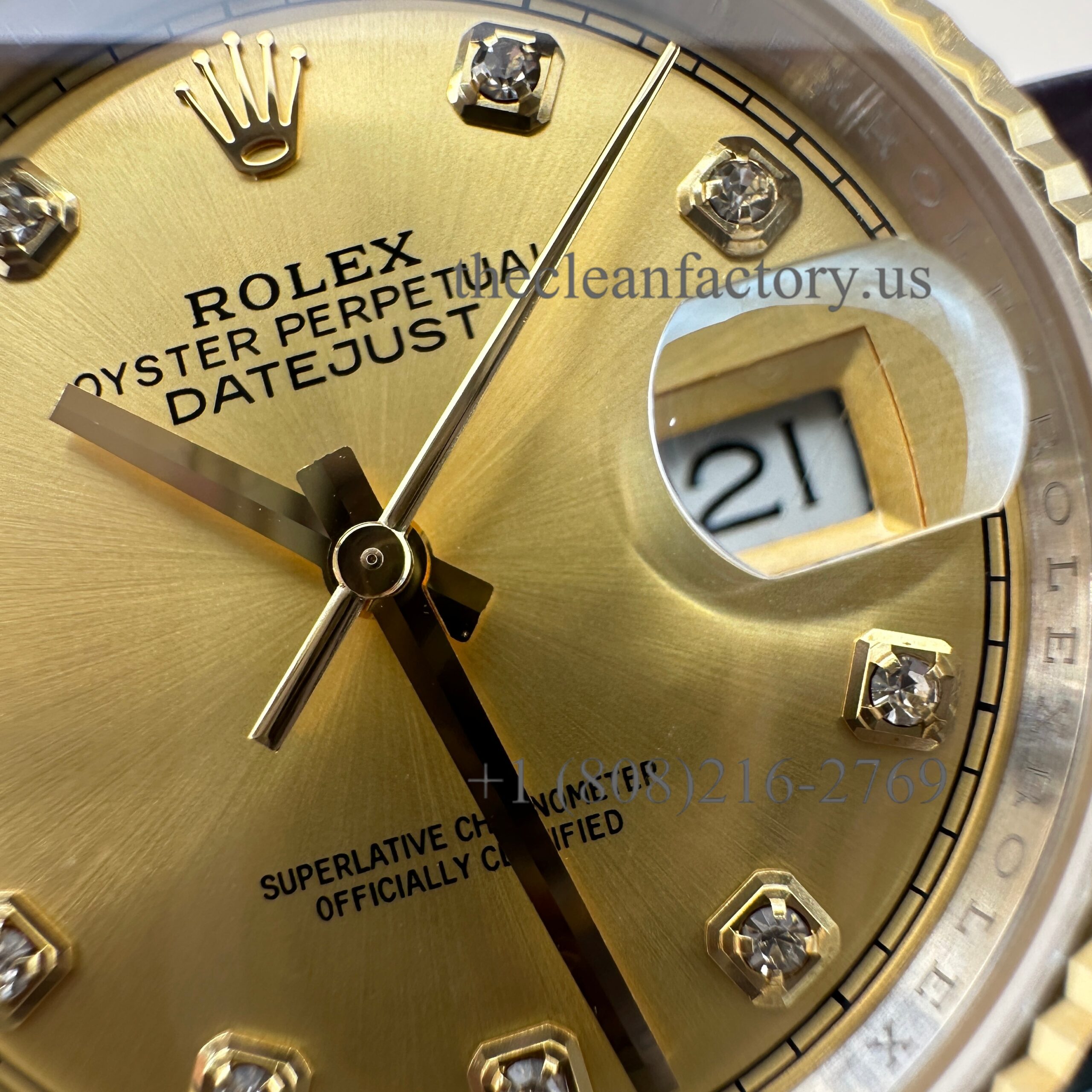 劳力士日志型 36 双色款:不锈钢和 18k 黄金。香槟色表盘镶嵌钻石、防刮蓝宝石水晶镜面,日期显示上方饰有凸透镜。时标 – 18k 金镶嵌钻石。腕表搭载 3235 型自动上链机械机芯,31 颗宝石,动力储存 60 小时。表带为 Jubilee 黄金钢和不锈钢表带。搭配折叠蚝式带扣和 Easylink 5 毫米舒适延长链节。防水深度 100 米/330 英尺。