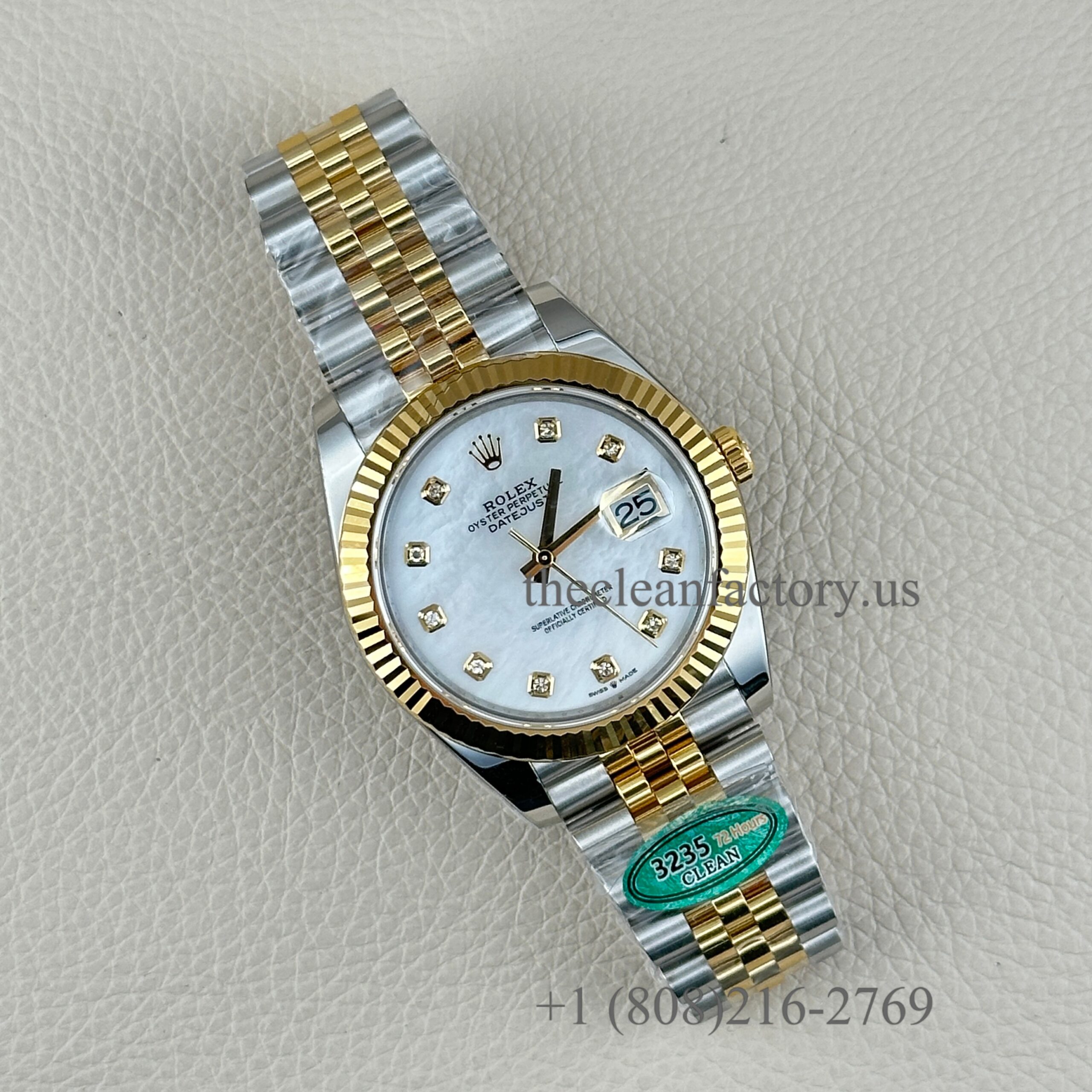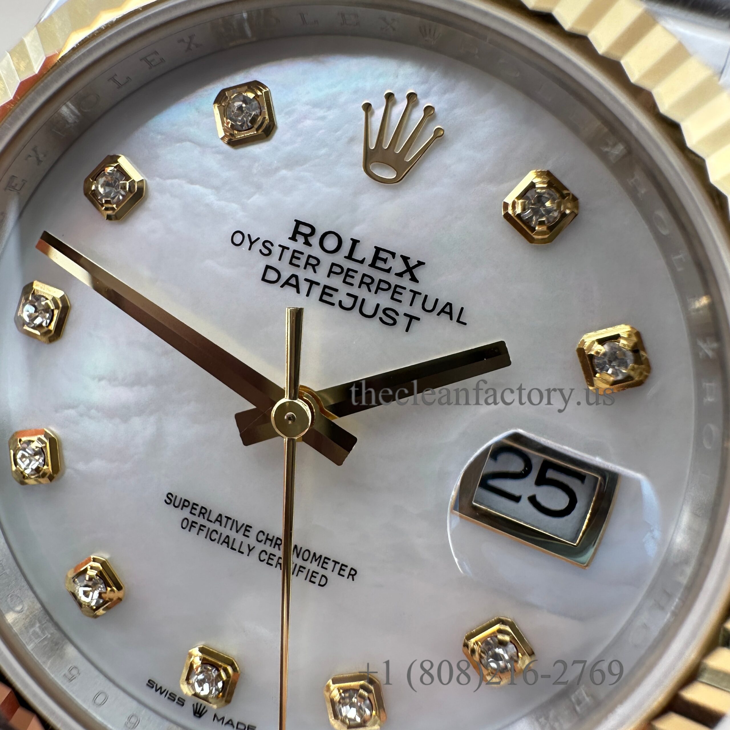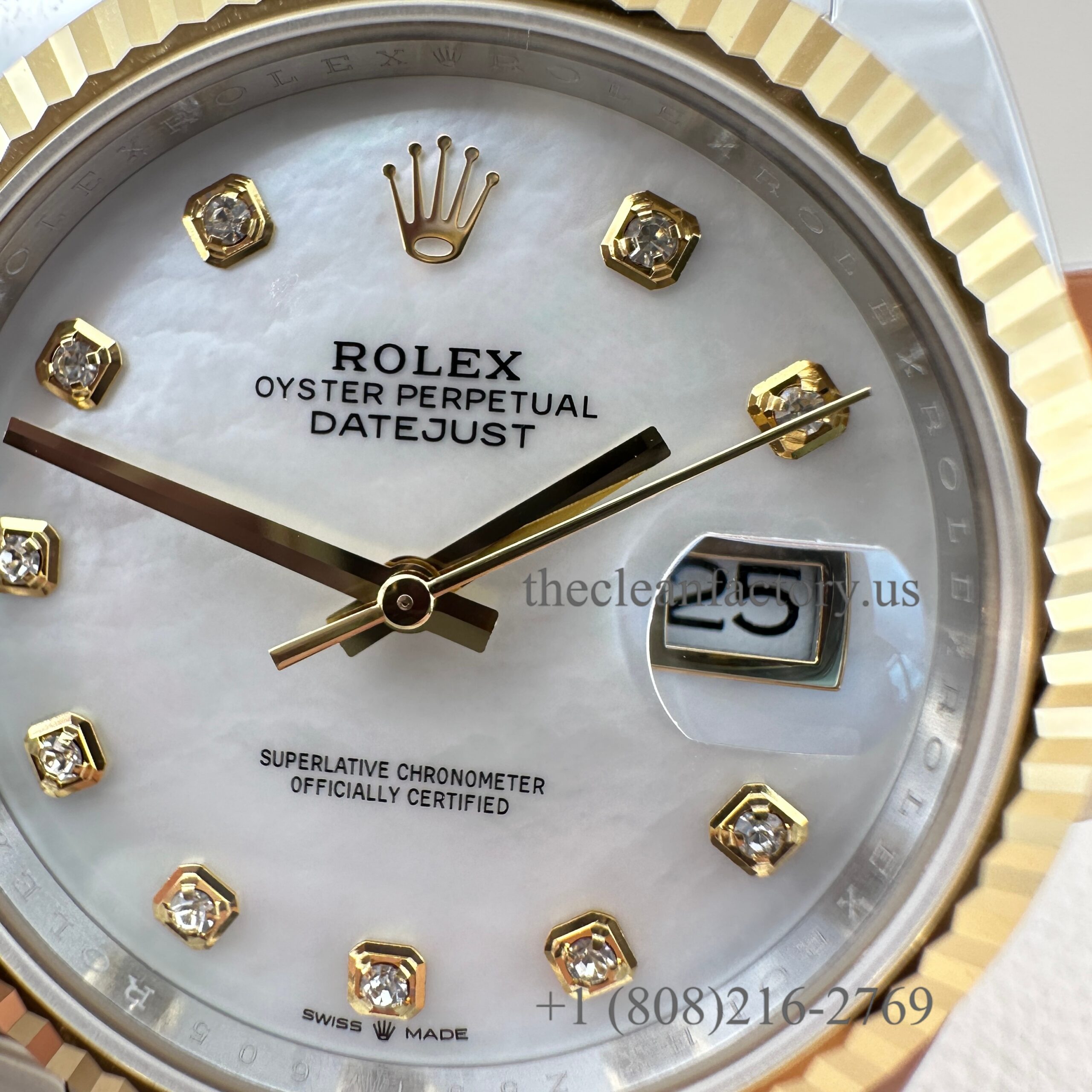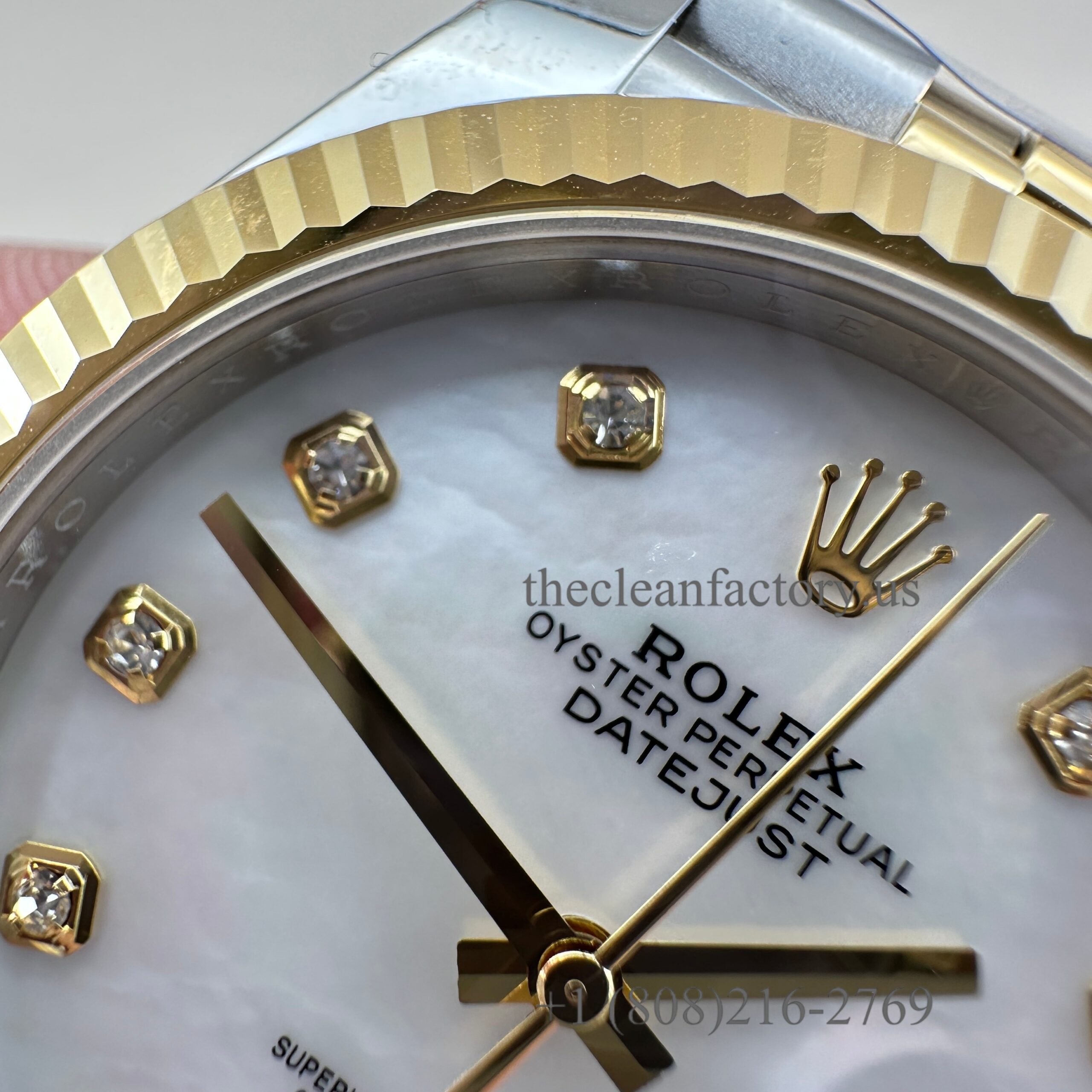 | DIAL | – White Mother of Pearl Diamond Dial . Hour markers with bright lume Superluminova blue luminescence phosphorescent that glows up to nine hours at night with uniform luminosity throughout – Highly legible with laser precision text, prints and engravings , 100% same as genuine – Correct Date font and size. – The color performance is no different from the genuine in Any light Angle – 18k gold wrapped hour markers and hands to prevent tarnishing |