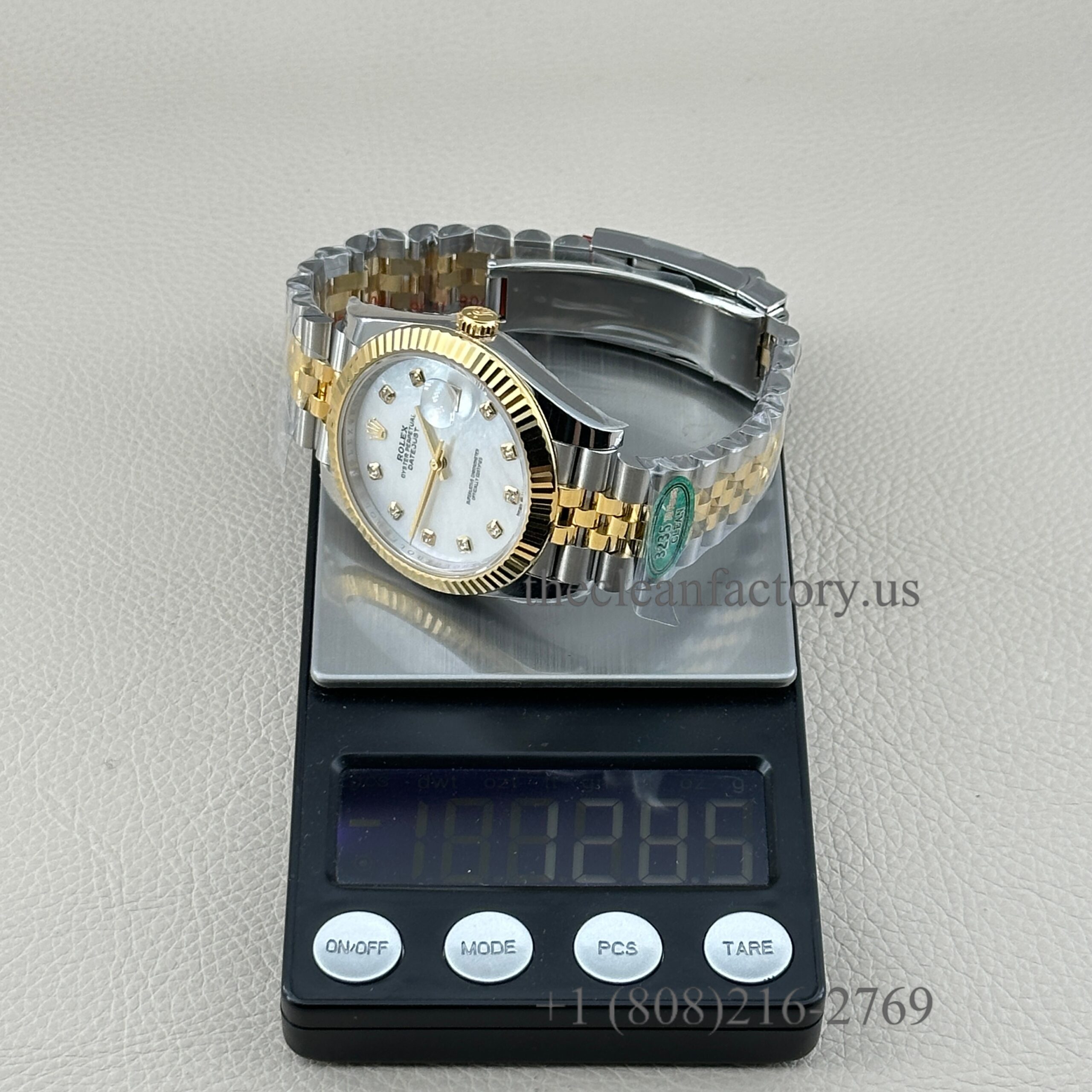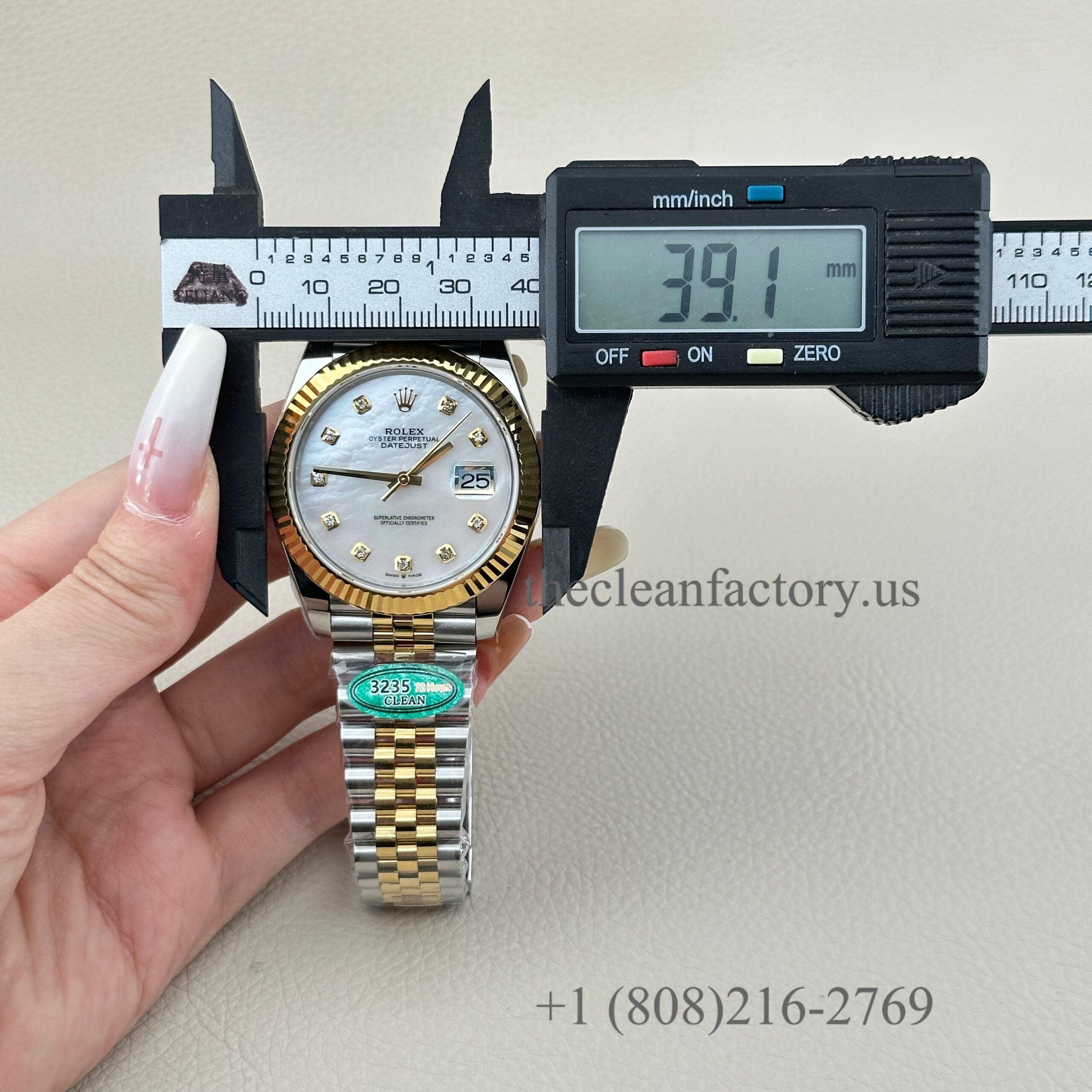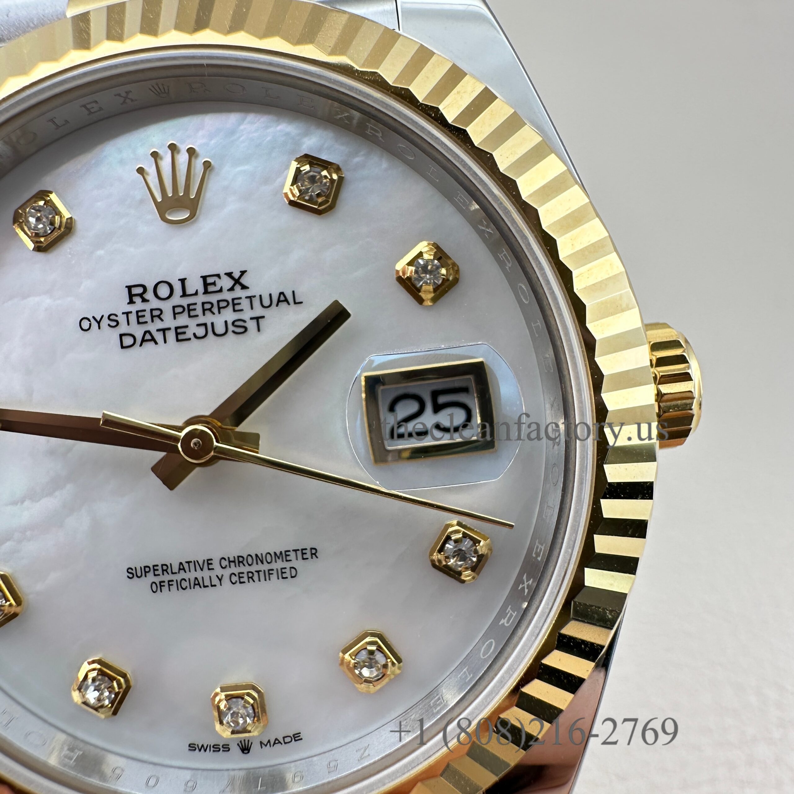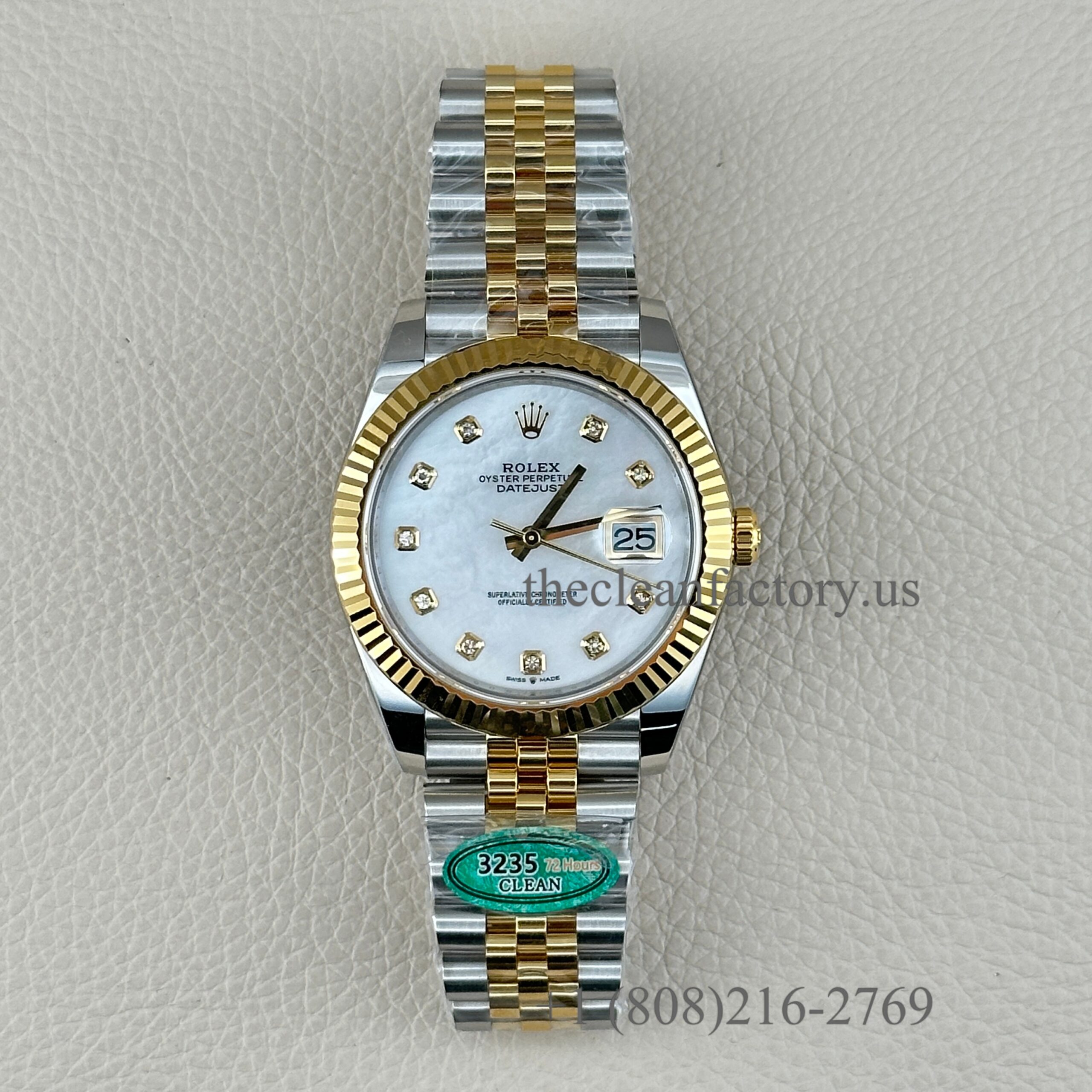 | DIAL | – White Mother of Pearl Diamond Dial . Hour markers with bright lume Superluminova blue luminescence phosphorescent that glows up to nine hours at night with uniform luminosity throughout – Highly legible with laser precision text, prints and engravings , 100% same as genuine – Correct Date font and size. – The color performance is no different from the genuine in Any light Angle – 18k gold wrapped hour markers and hands to prevent tarnishing |